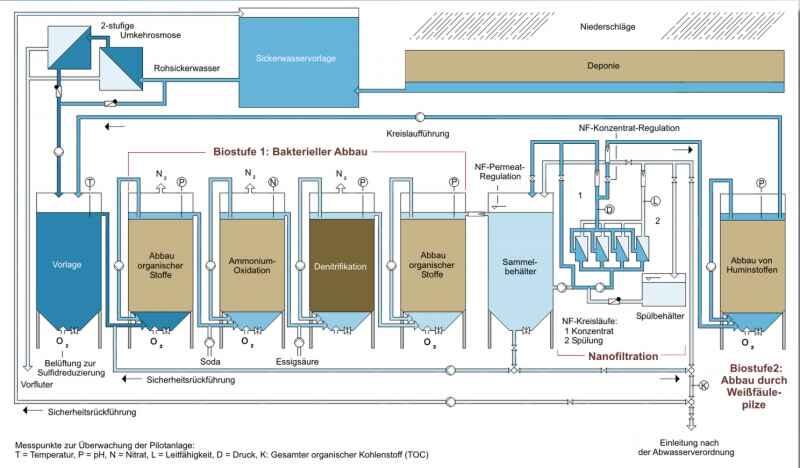 Sickerwasserkonzentrate enthalten im Vergleich zu Rohsickerwasser einen relativ hohen Anteil schwer abbaubarer Verbindungen. Dies sind vor allem wasserlösliche Huminstoffe, die aufgrund ihrer Größe von Bakterien nicht in vertretbaren Zeiträumen verwertet werden können. Nach der Vorbehandlung in "Biostufe 1" konzentriert eine Nanofiltrationsanlage die organischen Reste in einen 10 %-igen Teilstrom auf. Der Filtratstrom mit 90 % des Gesamtvolumens kann gemäß der Abwasserverordnung eingeleitet werden. In der "Biostufe 2" werden die Huminstoffe des verbliebenen Konzentrats von Weiß- bzw. Braunfäulepilze extrazellulär abgebaut. Die Abbauprodukte werden in die "Biostufe 1" zurückgeleitet, wo sie von Bakterien mineralisiert werden.
