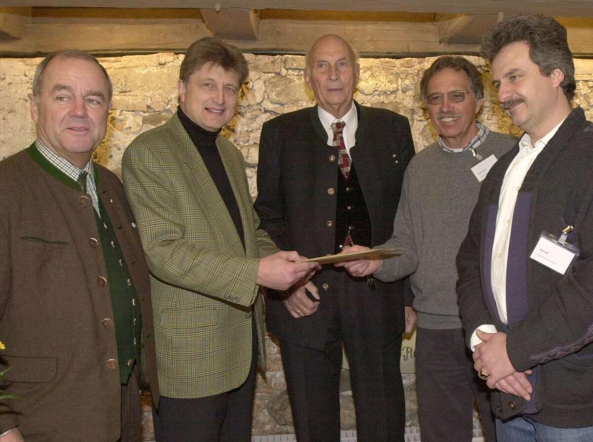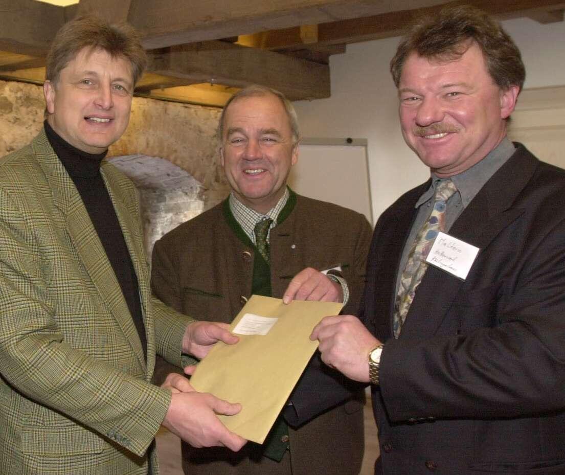 Beppo Maltan (r.) von der DAV-Sektion Berchtesgaden nimmt aus den Händen von Kuratoriumsmitglied Wolfgang Gröbl (M.) und DBU-Generalsekretär Fritz Brickwedde (l.) das Bewilligungsschreiben in Empfang.