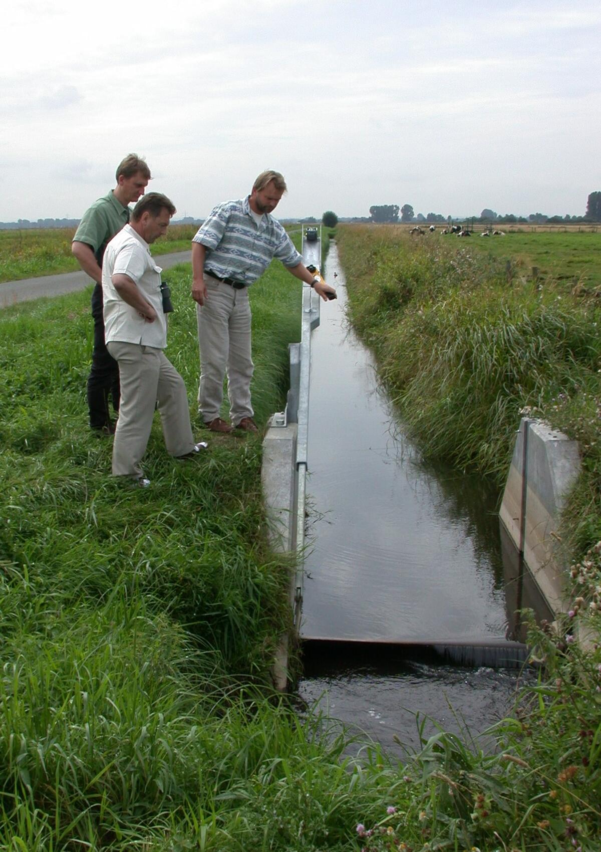 Heinrich Beltling (re.) vom Naturschutzzentrum Dümmer der Bezirksregierung Weser-Ems erläutert Dr. Uwe Fuellhaas, DBU, (li,) und Franz Debatin, Preisträger der Goldenen Natur 2001, eine Staustufe zur Wiedervernässung des Niedermoores am Dümmer.