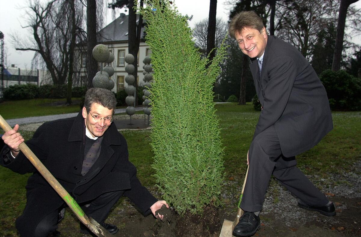Hans-Hartmut Escher (li.), Geschäftsführer der Naturschutzstiftung des Landkreises Osnabrück, und Fritz Brickwedde, DBU-Generalsekretär, pflanzen den "Baum des Jahres 2002" im Park der Stiftung.