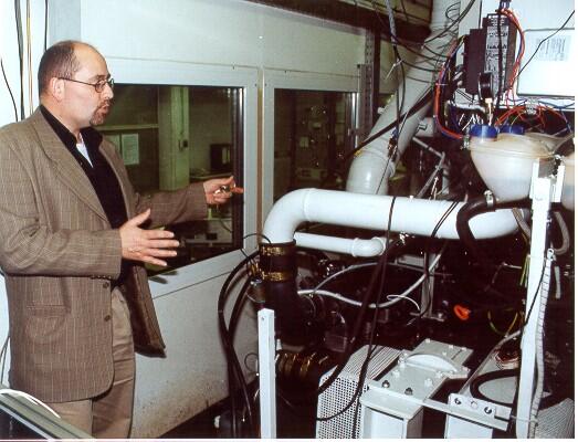 Am Prüfstand der Fachhochschule Dortmund erläutert Dr. Bernd Bartunek, Geschäftsführer der GVH Entwicklungsgesellschaft für Verbrennungsmotoren und Energietechnik (Gelsenkirchen), die Funktionsweise des neuen Erdgasmotors.