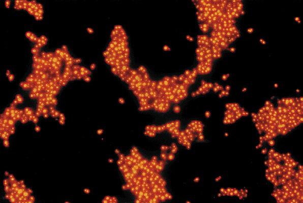 Hier sind sie unter dem Fluorszens-Mikroskop als kleine Kügelchen zu erkennen: Die erste Phase ihrer Entstehung liegt in den Zellen, in denen die Biopolymere (PHB-Granula) herangezüchtet werden.