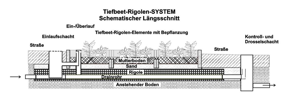 In Siedlungsgebieten lasse sich der Bodenwasserspeicher mit Hilfe der dezentralen Regenwasserbewirtschaftung aktivieren. Dabei werde das Niederschlagswasser von Dach- und Verkehrsflächen über sogenannte Mulden-Rigolen-Systeme in den Untergrund versickert und fließe von dort allenfalls stark verzögert Bächen und Flüssen zu. Dagegen nehme man bei der konventionellen Regenentwässerung durch Kanäle in Kauf, dass der Boden unter Städten als Wasserspeicher verloren gehe. Häufig werde in diesem Zusammenhang die zunehmende Versiegelung der Landschaft pauschal als Grund für die Häufung der Hochwasser genannt. Aus der Sicht des Hochwasserschutzes sei es jedoch das falsche System der Entwässerung, das zu negativen Folgen führe.