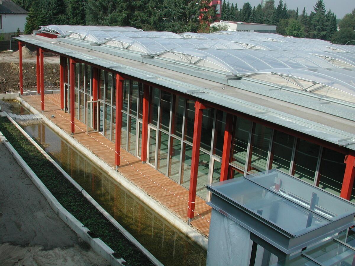 Diesen Ansprüchen folge die Membrandachkonstruktion. Das lichtdurchlässige Dach kombiniere die Möglichkeit der passiven Solarenergienutzung - Wärmeenergie im Winter und Tageslicht durch Zenitlicht - mit hohen Komfortanforderungen an Raumklima, Licht und Akustik nach den speziellen Bedürfnissen der darunter liegenden Räume und ihrer Nutzer. Jedes Dachfeld könne durch seinen mehrlagigen Aufbau der jeweiligen Raumnutzung individuell angepasst werden. So bestehe über dem Bürobereich und dem Lager die innenliegende Schicht aus einer stark gedämmten geschlossenen Ebene mit hoher Wärmeschutz- und Schallschutzqualität. Über den Konferenz- und Ausstellungsräumen sei der Gesamtaufbau lichtdurchlässig. Gleichzeitig gestatte die computergesteuerte Tageslichttechnik ein Verschatten oder Verdunkeln der Räume durch drehbare Lamellen, die dem jeweiligen Sonnenstand nachgeführt würden, um im Sommer Überhitzung zu vermeiden und im Winter für angenehme Raumtemperaturen zu sorgen.