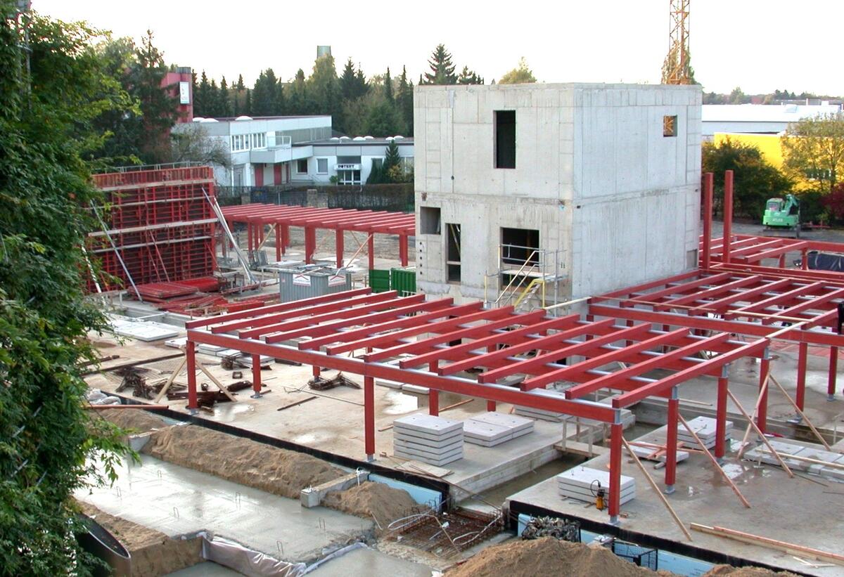 Hier im Rohbau deutlich zu erkennen: Das tragende Element des Neubaus ist ein nachwachsender Rohstoff: Holz.