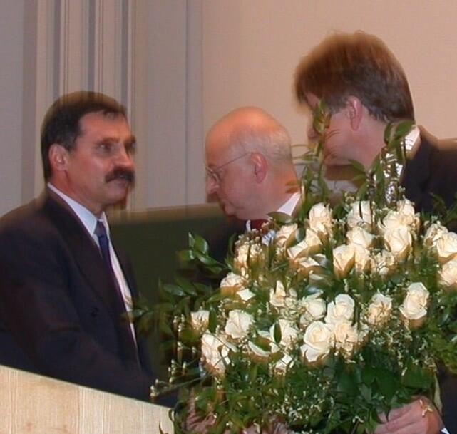 Prof. Dr. Peter Ay (l.), Dekan der Fakultät Umweltwissenschaften und Verfahrenstechnik der BTU Cottbus, gratuliert DBU-Generalsekretär Fritz Brickwedde zur Verleihung der Ehrendoktorwürde. In der Mitte BTU-Präsident Prof. Dr. Ernst Sigmund.