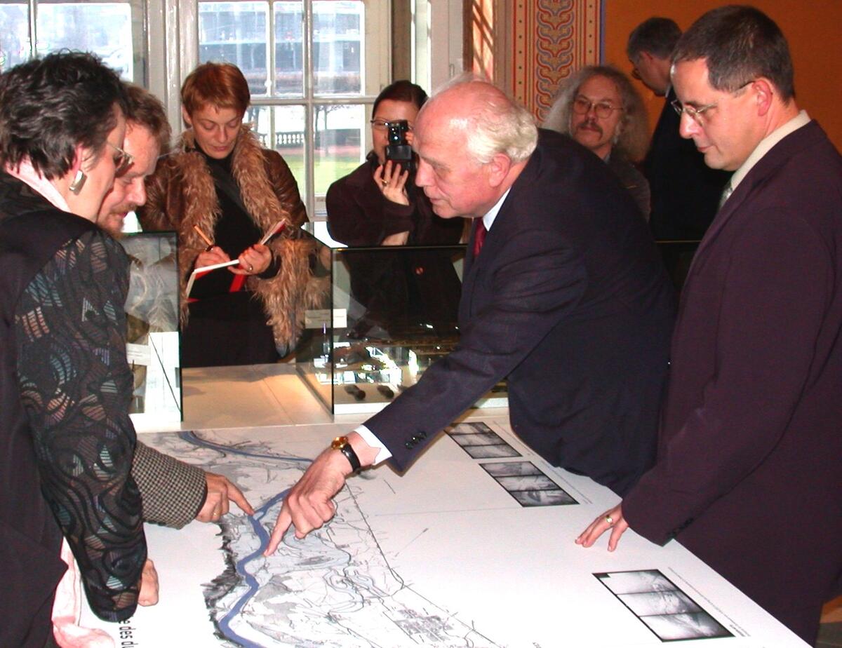 Beim Rundgang durch die DBU-geförderte Ausstellung in Dresden (v.l.): Landesarchäologin Dr. Judith Oexle, DBU-Kuratoriumsvorsitzender Prof. Dr. Hans Tietmeyer, Sachsens Umwelt- und Landwirtschaftsminister Steffen Flath.