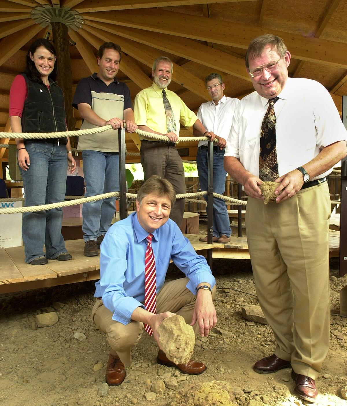 Das Thema Boden liegt der DBU am Herzen: Hier DBU-Generalsekretär Dr.-Ing. E. h. Fritz Brickwedde (li.) mit Landrat Manfred Hugo (re.)bei der Einweihung des Bodenparks am Schölerberg im Juli 2003. Im Hintergrund (v.r.) Hartmut Escher, Geschäftsführer der Naturschutzstiftung des Landkreises, dessen Kuratoriumsvorsitzender Hermann-Josef Görtz sowie Timo Kluttig vom Fachdienst Umwelt und Praktikantin Katharina Weiskopf.
