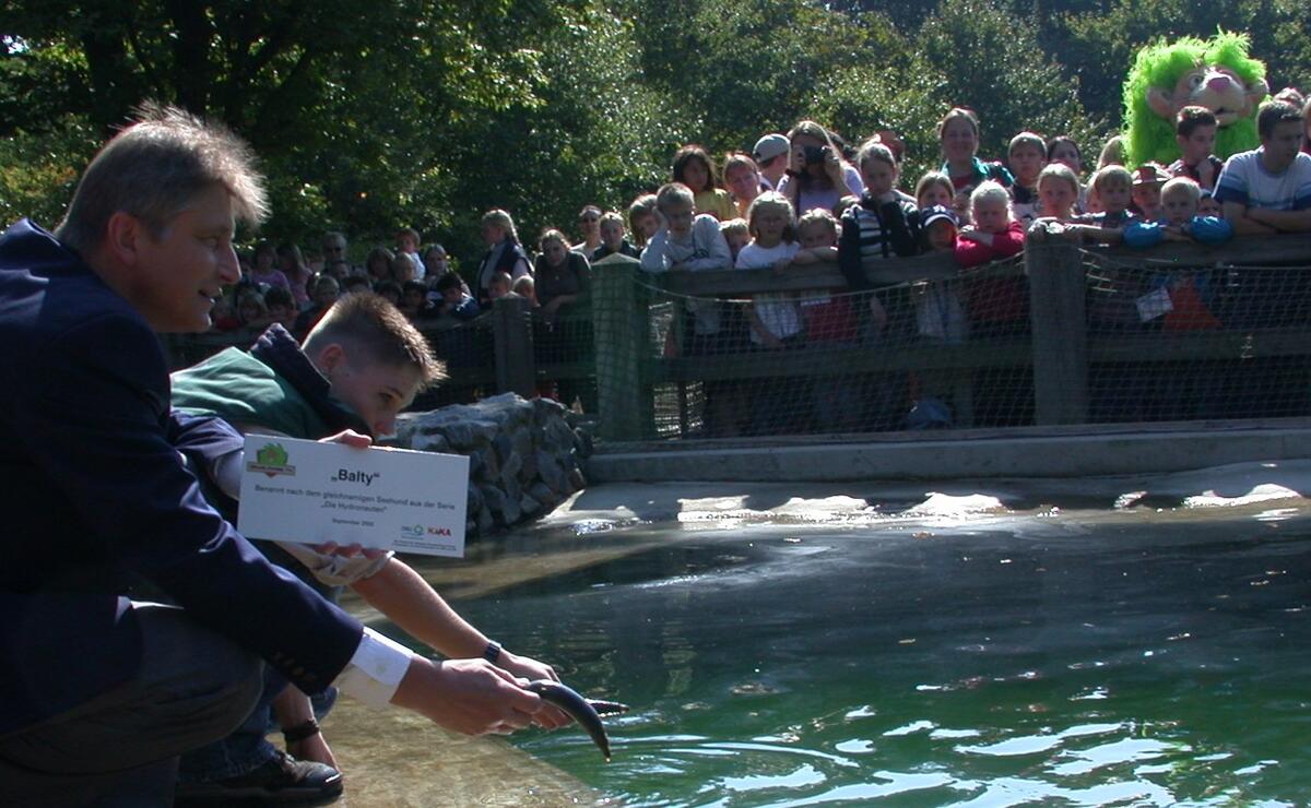 Osnabrück. Seehunde weisen als besonderes Merkmal das Fehlen eines äußeren Ohres auf. Ob ein Seehund im Zoo Osnabrück trotzdem auf seinen neuen Namen "Balty" hört, ist für die jungen Zoobesucher äußerst wichtig. Weniger wichtig für die Initiative "Graslöwen TV" der Deutschen Bundesstiftung Umwelt (DBU), die die heutige Seehundtaufe anlässlich des Starts ihrer zweiten Umweltserie "Die Hydronauten" veranlasst hat. Für sie steht die Idee im Vordergrund, ihre seit 1999 mit dem Kinderkanal (KI.KA) von ARD und ZDF laufende Initiative auch vor Ort zu verankern und in Osnabrück, dem Sitz der DBU, Zeichen zu setzen. "Wir möchten Kinder besonders im Grundschulalter über spannende Fernsehsendungen zu einem verantwortungsvollen Umgang mit ihrer Umwelt bewegen", betont Dr.-Ing. E. h. Fritz Brickwedde, Generalsekretär der DBU.