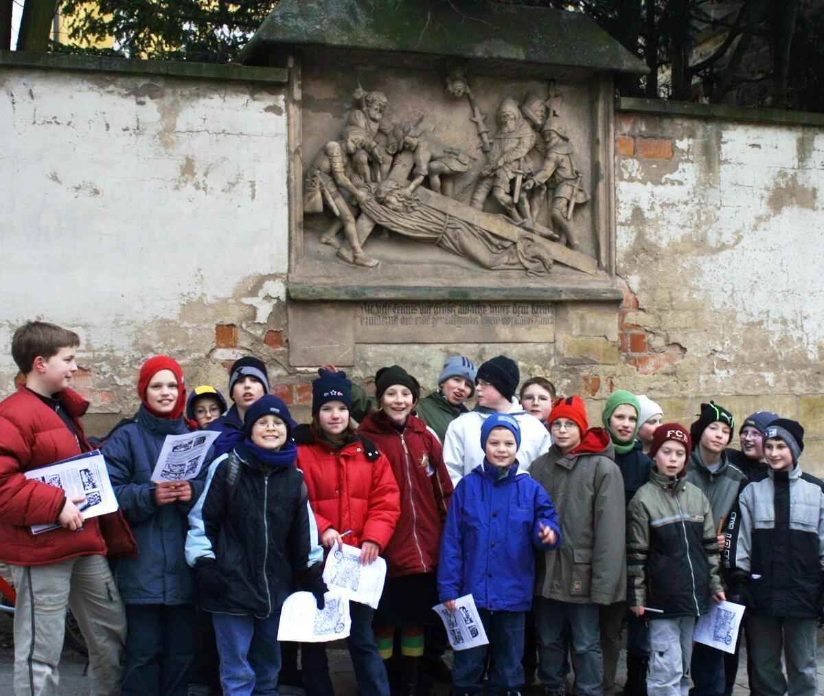 Klinken putzen für den KreuzwegDie Schüler machten sich mit vielen Aktionen eifrig ans Spendensammeln. Die Stadt Bamberg übernahm die Kosten für eines der sieben Reliefs, und auch das Geld für die Restaurierung zweier weiterer Stationen hatten die Schüler bald beisammen. Dort, wo noch restliche Mittel fehlten, halfen Stadt und Bürger nach, um mit fachlicher Unterstützung des