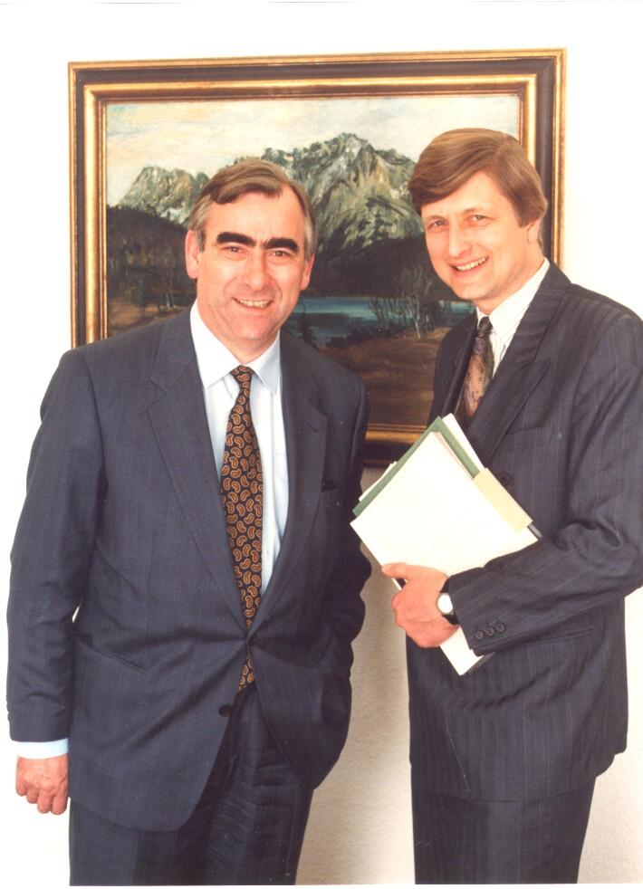 Der "geistige Vater" der DBU, der damalige Bundesfinanzminister Dr. Theo Waigel (l.), mit dem frisch gewählten DBU-Generalsekretär Fritz Brickwedde bei der ersten Kuratoriumssitzung nach Aufnahme der Arbeit am 22. April 1991.