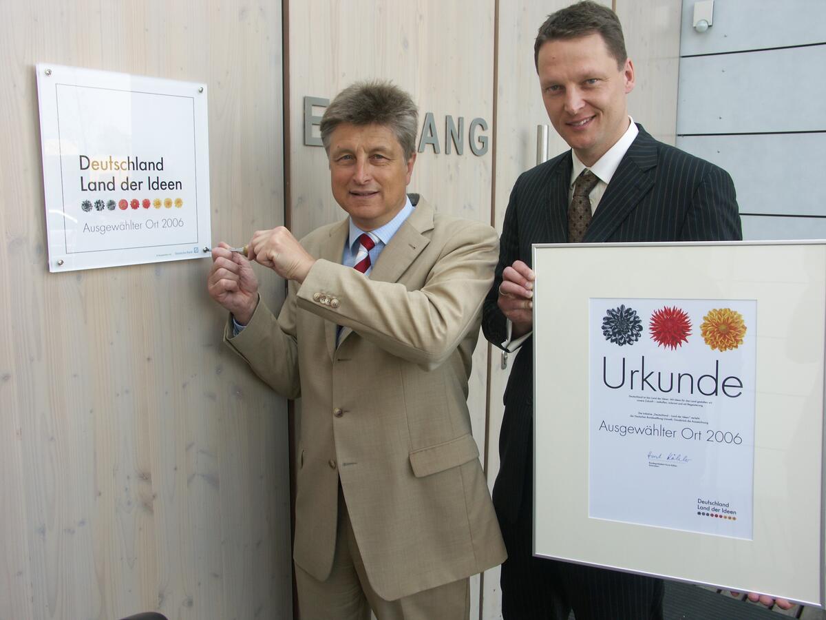 Deutschen Bank Osnabrück, dem Sponsor der bundesweiten Aktion, am Zentrum für Umweltkommunikation (ZUK) der DBU eine Plexiglas-Platte, die die DBU als einen der 365 ausgewählten Orte des Jahres ausweist.
