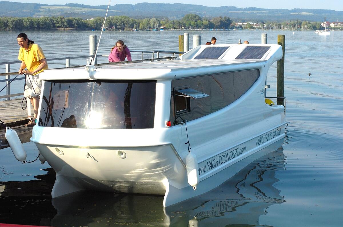 Mobil auf dem Wasser dank Strom aus Wind und SonneDer 8,66 Meter lange, 2,49 Meter breite und 2,60 Meter hohe Prototyp ermöglicht bis zu sechs Passagieren, ohne Tankstopp zu reisen: Die Schiffsschraube der umweltfreundlichen Yacht wird von Solarzellen auf dem begehbaren Sonnendeck mit Energie versorgt. Überschüssigen Strom aus der leistungsstarken Photovoltaikanlage speichern zwei Blei-Gel-Akkus. Sie ermöglichen bei bedecktem Himmel für bis zu 15 Stunden die Weiterfahrt mit einer Reisegeschwindigkeit von knapp vier Knoten, das sind rund sieben Stundenkilometer. Während der Liegezeit sorgt zusätzlich ein Windgenerator auf dem Heck für Strom. Weniger aerodynamisch, denn hydrodynamisch: Bei der Planung des Rumpfes achteten die Konstrukteure besonders darauf, dass sich das Wanderboot möglichst ohne großen Wasserwiderstand vorwärts bewegen kann. Energiesparend ist zudem auch die innovative Antriebstechnik mit zwei Gleichstrommotoren. Im vergangenen Jahr wurde die Ideenschmiede Yacht Concept Solartechnology daher für den