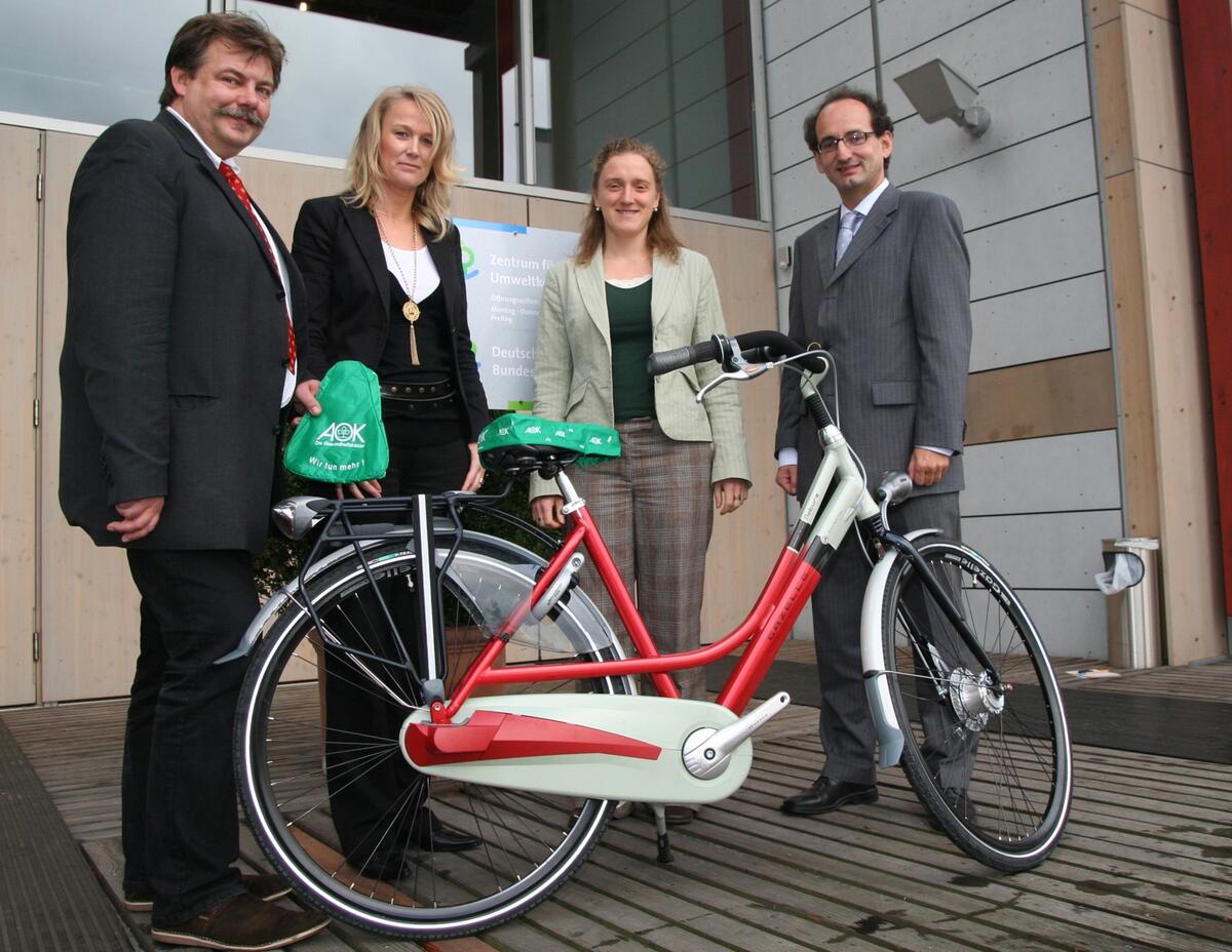 Osnabrück. Sie ließ den Wagen stehen und trat stattdessen in die Pedalen. Der fitte Start in den Arbeitstag hat sich für Meike Wunderlich besonders gelohnt: Die Mitarbeiterin im Zentrum für Umweltkommunikation (ZUK) der Deutschen Bundesstiftung Umwelt (DBU) gewann im Rahmen der Sommeraktion „Mit dem Rad zur Arbeit“ einen neuen Drahtesel. Nach einer Auslosung unter allen aktiven Pedalrittern überreichte Peter Meckfessel, Firmenkundenberater der Allgemeinen Ortskrankenkasse (AOK), heute zum Abschluss der landesweiten Initiative von AOK und dem Allgemeinen Deutschen Fahrrad-Club (ADFC) Niedersachsen den Preis. Eine gelungene Überraschung: Meike Wunderlich erfuhr erst zur Übergabe von ihrem Glück. „Ich habe noch nie etwas gewonnen“, freute sich Wunderlich. Bei der DBU haben 20 Mitarbeiter mit sieben Teams an der Aktion teilgenommen. „Eine ganz sportliche Truppe“, weiß DBU-Verwaltungschef Michael Dittrich aus Erfahrung: „Wir sind erst kürzlich mit allen ZUK-Mitarbeitern nach Kalkriese geradelt.“