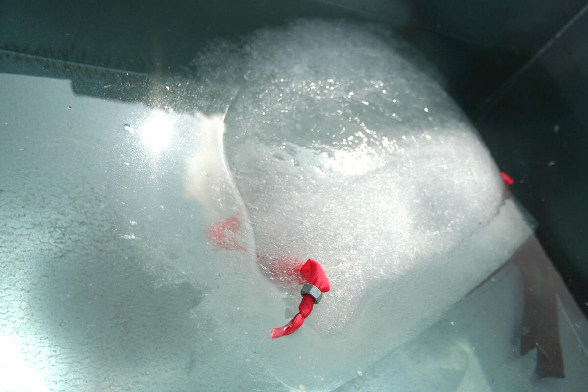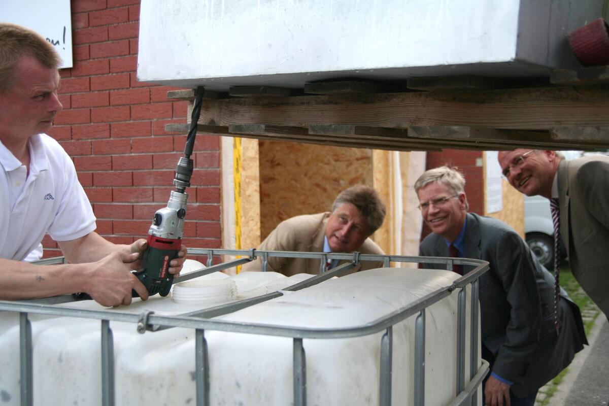 Staub zum Wettende mit. „Unsere Lehrlinge haben im Rahmen ihrer außerbetrieblichen Ausbildung bestimmt 150 Stunden Engagement in die Vorbereitung gesteckt.“ Knapp 30 Zentimeter Mineralwolle und eine luftdichte Folie schützten das Eis im Inneren vorm Schmelzen. Zwei Stunden brauchten die Handwerker, um das Ergebnis zu ermitteln: Mit Hilfe des Radladers zogen sie die Wanne mit dem Eis aus dem Mini-Haus, bohrten ein Loch in das Gefäß und ließen das geschmolzene Wasser ab. 884 Liter waren anfangs gefroren. 580 Liter fingen die Handwerker in einer großen Tonne auf.