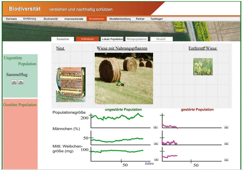 »Warum sind seit zwei Jahren die Nisthilfen in unserem Garten ohne Bewohner?« – solche Fragen werden zum Ausgangspunkt für die interaktive Auseinandersetzung. Der Nutzer gibt Parameter ein, die den Lebensraum während der Fortpflanzungsperiode charakterisieren, und erhält Einblick in die Entwicklung von Wildbienenpopulationen sowohl während einer Saison als auch auf der Zeitskala von vielen Jahren. Es wird gezeigt, wie Störungen – zum Beispiel eine Wiesenmahd im Mai – lokales Aussterben bewirken, aber auch wie einfache Schutzmaßnahmen zur Verbesserung der Überlebenschancen beitragen können. Das Programm richtet sich an Schüler der Sekundarstufe II.