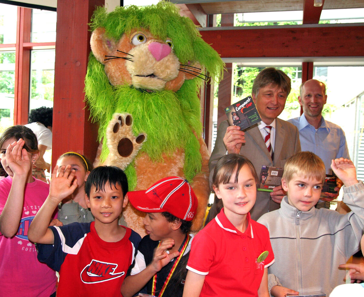 Osnabrück. Freundlich brüllte heute der „Graslöwe“ im Park der Deutschen Bundesstiftung Umwelt (DBU) und begrüßte 60 Drittklässler mit Migrationshintergrund aus Stadt und Landkreis Osnabrück, die am DBU-Sprachfördercamp teilnehmen. An der Seite von Dr.-Ing. E. h. Fritz Brickwedde, DBU-Generalsekretär, überreichte der Umweltbotschafter den Schülern das Hörspiel „Die Currywurst-Lüge“. „Diesen 60-minütigen Umweltkrimi auf CD vollständig zu verstehen, ist ein Ziel des Sommercamps“, sagte Brickwedde und richtete sich direkt an die Kinder: „Jetzt beginnen drei spiel- und lehrreiche Wochen, in denen wir euch auch neugierig auf Natur machen wollen.“ Los geht das Projekt „Natur und Sprache auf der Spur“ mit der Beteiligung 14 regionaler Partner am 14. Juli und endet mit dem „Markt der Möglichkeiten“ am 1. August im Zoo. In dieser Zeit werden die Schüler ihre Zweitsprache Deutsch im Umweltbildungszentrum Noller Schlucht in Dissen und im Schullandheim Mentrup-Hagen verbessern. 123.000 Euro gibt die DBU dazu.