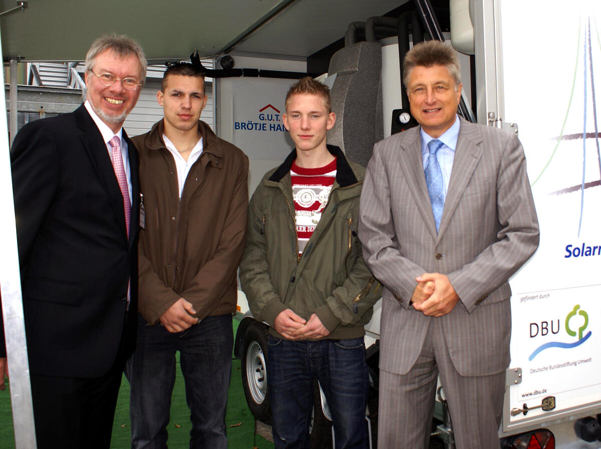 Wilhelmshaven. Aufträge kalkulieren, Angebote erstellen, Produkte nachhaltig entwickeln und termingerecht produzieren – was für Auszubildende in Handwerk und Industrie Alltag ist, erleben seit einem Jahr auch 40 Schüler der Berufsbildenden Schulen Friedenstraße in Wilhelmshaven. In der Berufseinstiegsschule mit eigener Produktionsstätte wird ein Unternehmen im Schulbetrieb nicht nur simuliert, sondern tatsächlich geführt. Immer im Fokus der Arbeit: das Konzept der Nachhaltigkeit. Als eines der ersten Produkte entstand nun eine mobile Solar-Duschanlage für Großveranstaltungen. Die Deutsche Bundesstiftung Umwelt (DBU) fördert das Bildungsprojekt mit rund 200.000 Euro. „Nachhaltiges Handeln ist für jeden Beruf und jede Branche von Bedeutung. Schüler müssen mit dieser Arbeitsrealität so früh wie möglich vertraut gemacht werden“, erklärt ihr Generalsekretär, Dr.-Ing. E. h. Fritz Brickwedde, heute anlässlich der Einweihung der neuen Fertigungshalle auf dem Schulgelände.