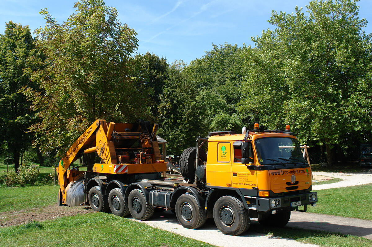 Insgesamt 21 ausgewachsene Bäume werden dafür an den Rand des Waldfriedhofs Dodesheide verpflanzt. Alle stammen aus einer früheren Untersuchungsanlage des Eigenbetriebs Grünflächen und Friedhöfe der Stadt Osnabrück in unmittelbarer Nähe. Da die Stadt das Gebiet allerdings langfristig in Bauland umwandelt, wandern die Eschen, Linden und Platanen nun 500 Meter weiter an einen neuen Platz. Der Erste der rund zehn Tonnen schweren Kolosse zog heute mit Hilfe einer speziellen Baumverpflanzmaschine um. Zunächst müssen die Wurzeln der Testbäume in den unterschiedlich angereicherten Böden verwachsen. In einem zweiten Schritt werden dann exemplarisch Rohre verlegt, um die Reaktion der Pflanzen auf Böden und Leitungen zu testen. „Der unmittelbar um die Rohre liegende Bereich sollte am Besten mit porenarmen Mischungen gefüllt werden. Denn je weniger Hohlräume vorhanden sind, desto schlechter können die Wurzeln in Richtung Leitungen und Rohre wachsen“, erklärt Christoph Bennerscheidt, Projektleiter am IKT.