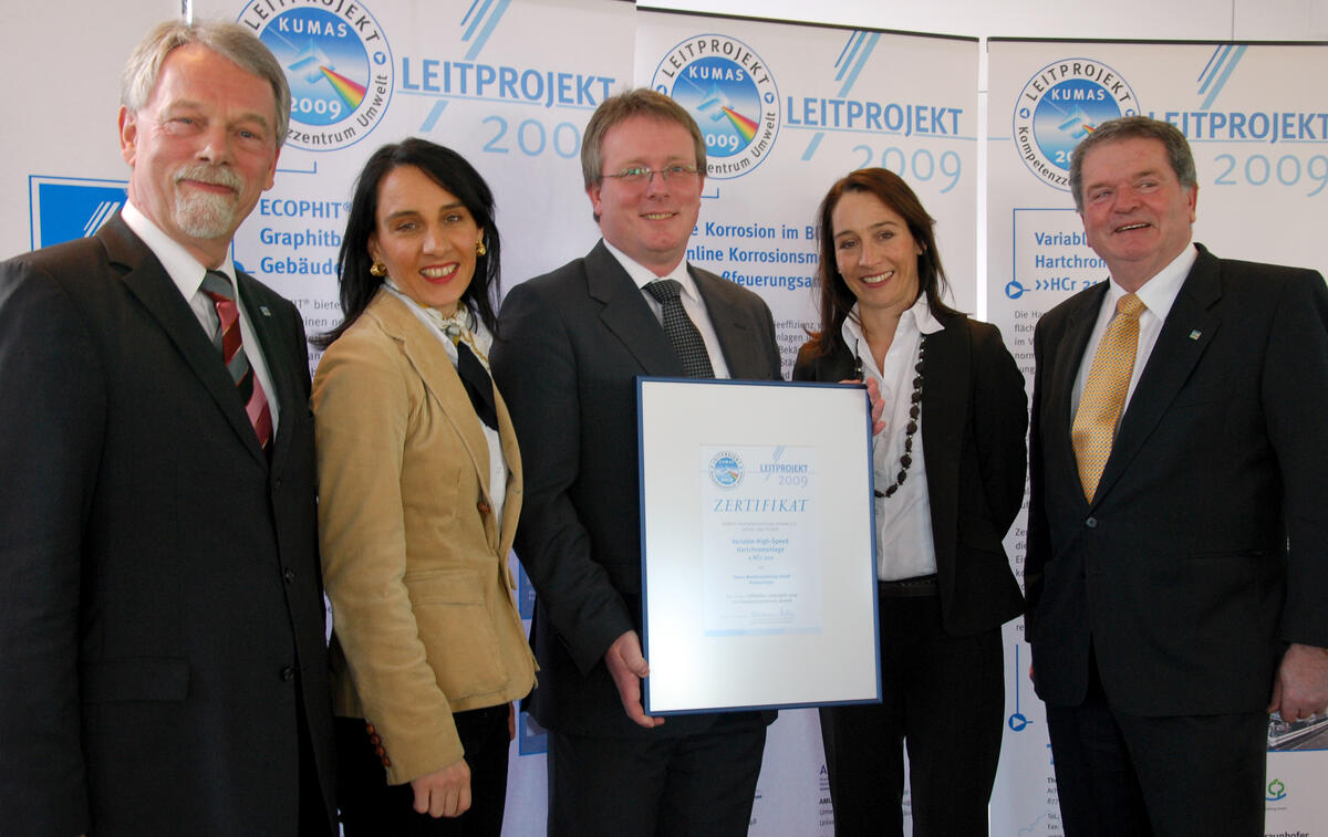 Augsburg. Ehrung für ein innovatives, umweltentlastendes Modellprojekt der Deutschen Bundesstiftung Umwelt (DBU): Aus den Händen des 1. Vorsitzenden des Kompetenzzentrums Umwelt (KUMAS) in Augsburg, Dr. Hermann Teufel, nahm heute Dr. Malte-Matthias Zimmer als Projektleiter im Namen der Firma Thoma Metallveredelung GmbH (Heimertingen) die Auszeichnung als „KUMAS Leitprojekt 2009“ in Empfang. Der mittelständische Betrieb hatte mit einer DBU-Finanzspritze von 110.000 Euro ein neues Verfahren zur Hartverchromung entwickelt, das ökologische und ökonomische Vorteile miteinander verbindet. DBU-Generalsekretär Dr.-Ing. E. h. Fritz Brickwedde: „Es freut uns sehr, dass eines der drei Leitprojekte dieses Jahres ein DBU-Projekt ist und wir mit unserer Schützenhilfe den Umwelttechnik-Standort Bayern in Deutschland voranbringen konnten.“