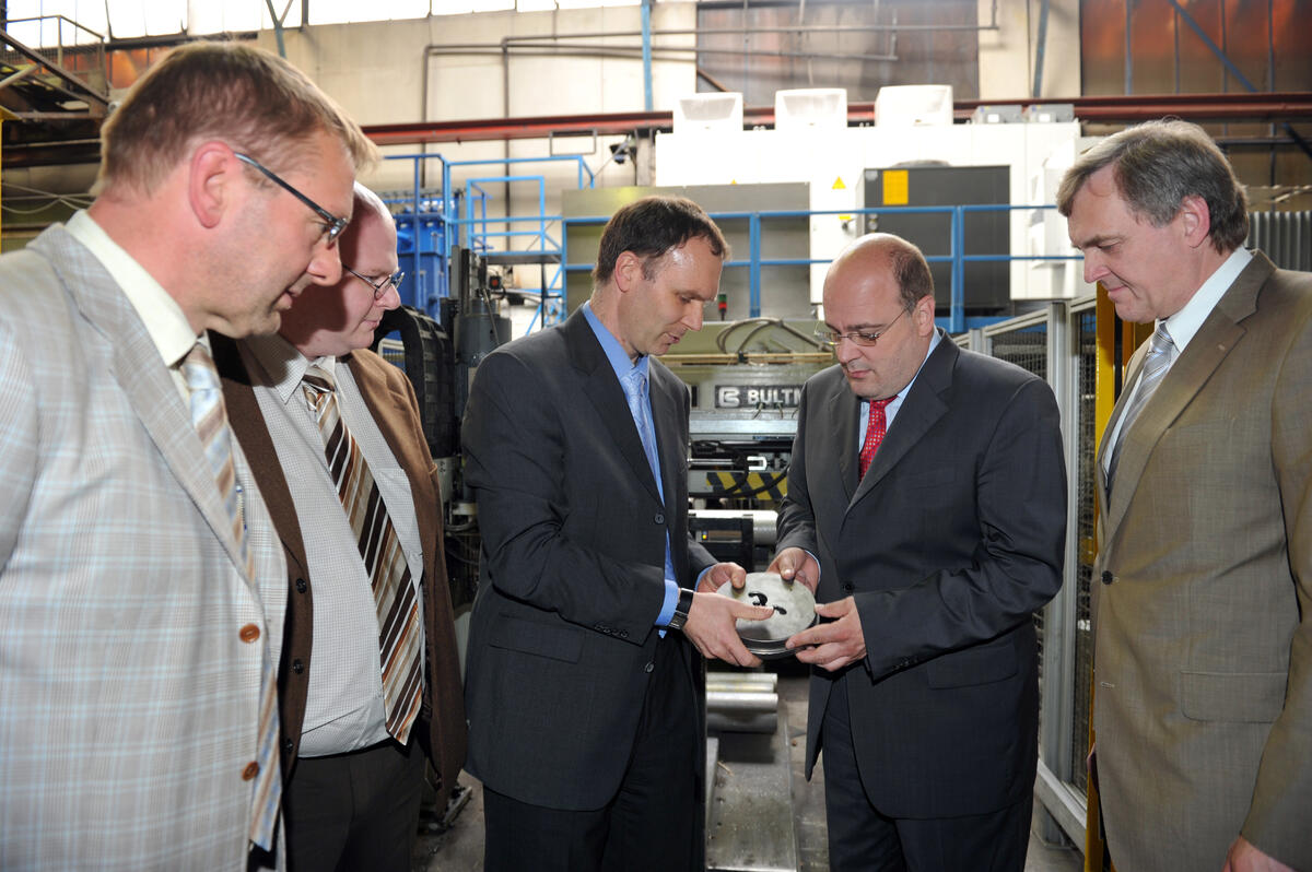 Minden. Was wären die kühnsten Ideen, die kreativsten Entwicklungen, wenn sie keiner in der Praxis umsetzt? Die kooperierenden Unternehmen Bültmann (Neuenrade) und Zenergy Power (Rheinbach) fanden mit ihrer klimaschonenden Technologie den Weg auf den Markt: Mit Hilfe der Deutschen Bundesstiftung Umwelt (DBU) entwickelten sie einen energiesparenden Magnetheizer für die metallverarbeitende Industrie. In dem mittelständischen Betrieb weseralu kam die Anlage weltweit erstmalig zum Einsatz. Der Mut hat sich gelohnt: „Mit dem neuen Verfahren sparen wir fast die Hälfte an Energie und können die Produktion um ein Viertel steigern“, so weseralu-Geschäftsführer Bardo Ostermeyer. Für Dr. Wulf Grimm, DBU-Abteilungsleiter Umwelttechnik, ist das ein Beispiel, „dass Ökonomie und Ökologie sich ideal ergänzen können“. Er war heute mit dem neuen DBU-Kuratoriumsmitglied Steffen Kampeter, Bundestagsabgeordneter und parlamentarischer Staatssekretär im Bundesfinanzministerium, bei weseralu in Minden.