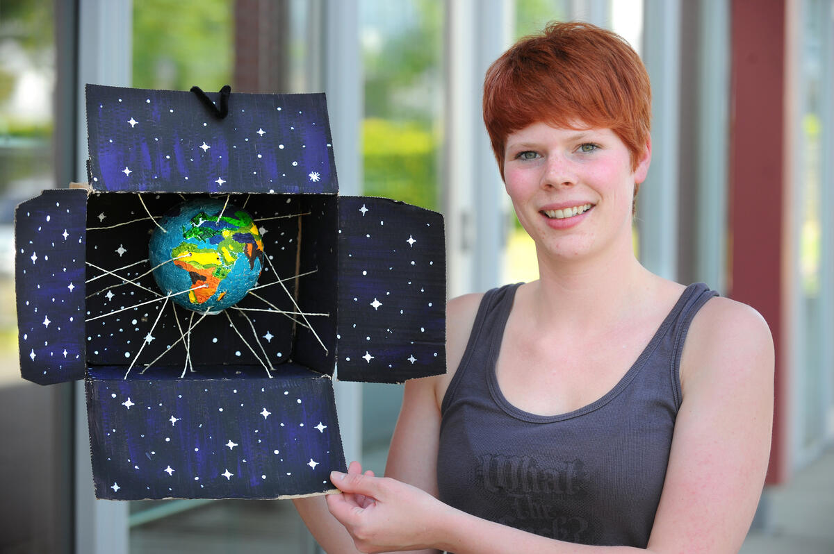 Ein Meer aus kunterbunten Kugeln und Kartons haben die Teilnehmer des Jugendkongresses „Jugend-Zukunft-Vielfalt“ 2011 zusammengestellt, die jetzt im Zentrum für Umweltkommunikation (ZUK) der DBU zu sehen sind. Viele dieser Kunstobjekte wurden von den Jugendlichen schon zu Hause gestaltet, denn sie haben die Kugeln in einem Karton zu sich nach Hause geschickt bekommen. Der Arbeitauftrag lautete: „Macht was draus!“. Diesem Aufruf ist die 25-jährige Jennifer Hülskötter aus Bremen nachgegangen und hat eine Erdkugel der besonderen Art gestaltet. „Die Fäden symbolisieren Netzwerke zwischen den einzelnen Ökosystemen. Wenn diese zerstört werden, leidet die ganze Erde und wird nicht mehr von den Ökosystemen gestützt“, so die Studentin der technischen und angewandten Biologie der Hochschule Bremen. Die Botschaft ihres Kunstobjektes lautet: „Schützt die Natur und bewahrt den Erhalt der biologischen Vielfalt! Dann wird unsere Erde weiterhin von den Ökosystemen gestützt.“