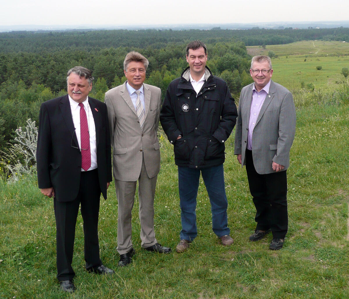 Tennenlohe. Um die Struktur- und Artenvielfalt auf den wertvollen Sandmagerrasenflächen im Naturschutzgebiet Tennenlohe weiter zu verbessern, wurde nun das Pferdegehege der DBU Naturerbefläche von 50 auf 85 Hektar und die Urwildpferdeherde von elf auf 14 Tiere erweitert. Ein neuer Fußgängerüberstieg verbindet die Rundwege um die Gatter der vierbeinigen „Landschaftspfleger“. Bayerns Umweltminister Dr. Markus Söder eröffnete heute das neue Gehege im DBU Naturerbe Tennenlohe gemeinsam mit Dr.-Ing. E. h. Fritz Brickwedde, Generalsekretär der Deutschen Bundesstiftung Umwelt (DBU), Gerhard Wägemann, Vorstandsmitglied im Landschaftspflegeverband Mittelfranken, und Eberhard Irlinger, Landrat des Landkreises Erlangen-Höchstadt. Beide Projekte wurden im Rahmen von Ausgleichsmaßnahmen finanziert: Die Deutsche Bahn stellte 250.000 Euro für die Erweiterung des Geheges zur Verfügung, 40.000 für den neuen Überstieg stammen aus Ausgleichszahlungen für Baumaßnahmen der US-Armee.