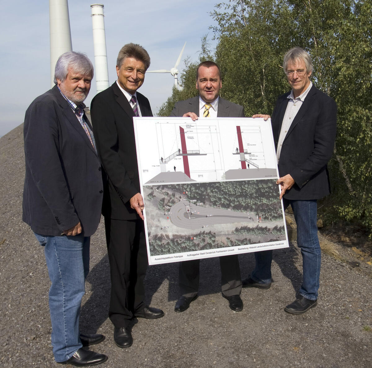 Osnabrück. Der Kultur- und Landschaftspark Piesberg in Osnabrück wird um eine Attraktion reicher. Eine Aussichtsplattform in 200 Metern Höhe rund um einen ehemaligen Windkraftturm soll Besuchern ab Herbst einen ungehinderten Blick über den gesamten Naturpark TERRA.vita ermöglichen. Speziell konzipierte Infotafeln, Karten und Bilder sollen Interessierte über seine kulturelle und naturräumliche Bedeutung und das Thema „Erneuerbare Energien“ informieren. Die Deutsche Bundesstiftung Umwelt (DBU) unterstützt den Bau des „begehbaren Exponates“ mit 40.000 Euro. „Vor allem die jüngere Generation kann durch die Mischung aus kognitiver Informationsvermittlung und emotionalen Naturerlebnissen viel Wissenswertes über die heimische Flora und Fauna erfahren“, sagte DBU-Generalsekretär Dr.-Ing. E. h. Fritz Brickwedde heute beim ersten Spatenstich zusammen mit Osnabrücks Oberbürgermeister Boris Pistorius, dem Fachbereichsleiter Umwelt der Stadt, Detlef Gerdts, und Piesberg-Projektleiter Karl-Heinz Uthmann.