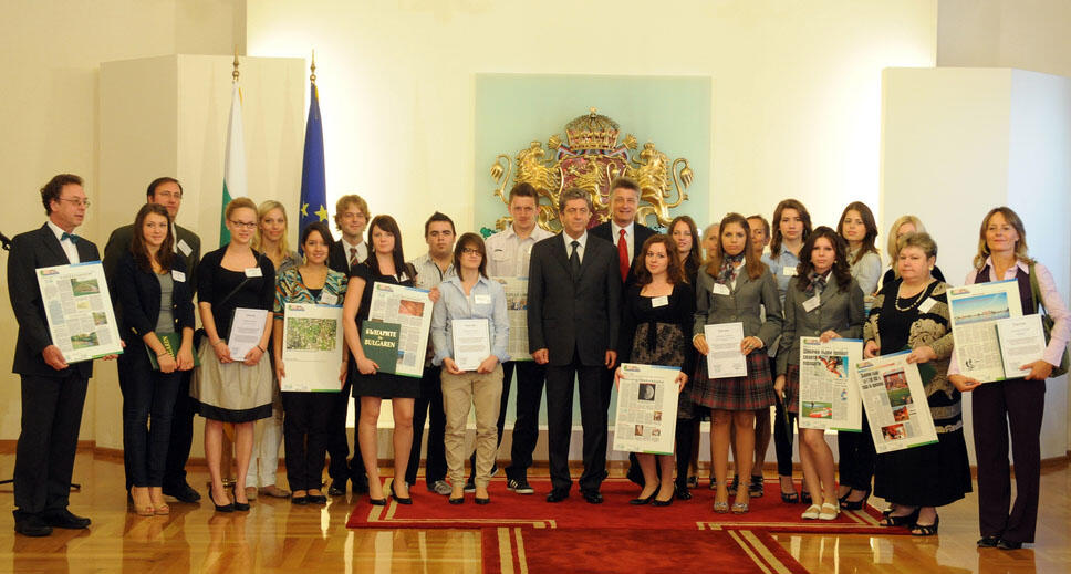 Osnabrück/Sofia. „Mit ihren informativen und spannenden Zeitungsartikeln haben die Schülerinnen und Schüler zum zweiten Mal eindrucksvoll bewiesen, wie interessant und wichtig die Recherche von Umweltthemen sein kann – gerade für junge Menschen. Die enge internationale Zusammenarbeit gibt den Nachwuchsjournalisten eine ganz besonders wichtige Tugend mit auf den Weg: Toleranz gegenüber anderen Menschen und Kulturen.“ – Mit diesen Worten lobte der bulgarische Staatspräsident Georgi Parwanow Schülergruppen aus Bulgarien, Deutschland, Kroatien, Rumänien und Ungarn für ihr Engagement im europäischen Umwelt- und Medienprojekt „Umwelt baut Brücken“. Gemeinsam mit Dr.-Ing. E. h. Fritz Brickwedde, Generalsekretär der Deutschen Bundesstiftung Umwelt (DBU), zeichnete Parwanow die Verfasser der besten Zeitungsbeiträge in seinem Amtssitz in Sofia aus. Das Projekt wird von der DBU und elf Partnerzeitungen unterstützt.