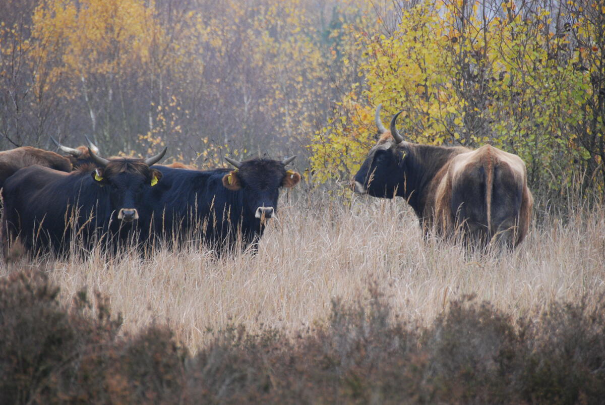 Oranienbaum/Gräfenhainichen. Bis zu 900 Kilogramm können die Bullen schwer werden. Und trotzdem sind sie um ein vielfaches leichter als die Panzer, die bis 1992 auf der DBU Naturerbefläche Oranienbaumer Heide – ehemals „Möhlau-Sollnitz“ – ihre Runden drehten. Eine Gemeinsamkeit haben die Heckrinder aber dennoch mit dem schweren Gefährt: Sie halten die schützenswerte Heidelandschaft offen. Was die Herde hinter den „Betreten verboten“-Schildern machen – davon können sich Besucher ab heute ein Bild machen: „Wir haben in den vergangenen Wochen zwölf Kilometer Weg entmunitionieren lassen und können diese Strecke ab sofort freigeben“, betonte Dr. Reinhard Stock, Referatsleiter der Deutschen Bundesstiftung Umwelt (DBU), heute zum ersten offiziellen Rundgang. Seit drei Monaten ist die gemeinnützige DBU Naturerbe GmbH rechtskräftige Eigentümerin der Oranienbaumer Heide. Sicheren Schrittes können so nun Natur- und Tierfreunde einen Blick auf das erfolgreich initiierte Weideprojekt der Hochschule Anhalt riskieren.