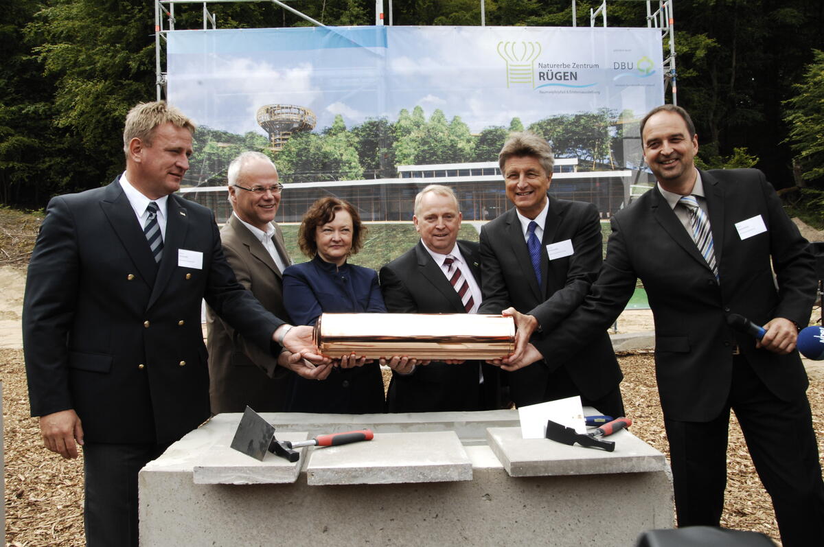 Prora/Binz. Münzen, Baupläne, die aktuelle Tageszeitung, ein Projektflyer und ein Feuerstein werden an die Grundsteinlegung für das „Naturerbe Zentrum Rügen“ erinnern. Verschlossen in einem Zylinder haben sie Dr. Till Backhaus, Umweltminister von Mecklenburg-Vorpommern, der Generalsekretär der Deutschen Bundesstiftung Umwelt (DBU), Dr.-Ing. E. h. Fritz Brickwedde, gemeinsam mit dem zukünftigen Betreiber und Vorstandssprecher der Erlebnis Akademie, Bernd Bayerköhler, dem Architekten, Josef Stöger, und weiteren Festrednern am „Alten Forsthaus Prora“ einbetoniert. Damit ist der Startschuss für den Bau des rund 2.000 Quadratmeter großen „Naturerbe Zentrum Rügen“ gefallen. Es wird als Informationszentrum mit Erlebnisausstellung und als Restaurant und Treffpunkt für Wanderungen dienen. Ein Naturerlebnis der besonderen Art entsteht zwischen den alten Buchen im Hintergrund: Der rund 1.250 Meter lange Baumwipfelpfad soll eine neue Perspektive auf Rügen eröffnen.