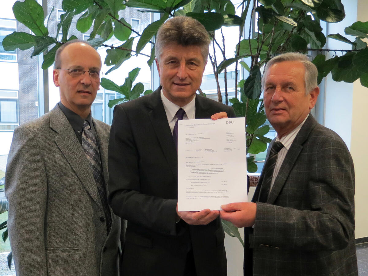 Osnabrück. Stickstoff in Düngemitteln lässt Pflanzen besser wachsen und trägt zur Ernährungssicherung der wachsenden Weltbevölkerung bei. Doch unerwünschte Stickstoffverluste belasten die Ökosysteme und tragen zum Treibhauseffekt bei. Im Rahmen der Förderinitiative „Verminderung von Stickstoffemissionen“, mit der die Deutsche Bundesstiftung Umwelt (DBU) einen wirksameren Einsatz von Stickstoff in der Landwirtschaft vorantreiben will, sind heute zwei neue Projekte initiiert worden. DBU-Generalsekretär Dr.-Ing. E. h. Fritz Brickwedde überreichte die Bewilligungsschreiben an Prof. Dr. Peter Seifert, Vizepräsident für Forschung und Wissenstransfer der Hochschule Osnabrück, und Prof. Dr. Herman Van den Weghe, Leiter der Außenstelle Vechta der Georg-August-Universität Göttingen. „Mit ihren Untersuchungen zu neuen Verfahren der Gülledüngung könnten überflüssige Stickstoffverluste deutlich gesenkt werden“, sagte Brickwedde in der Hochschule Osnabrück. Die DBU gibt insgesamt rund 663.000 Euro.