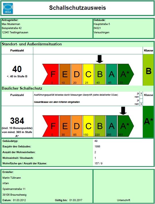 Ein von der Deutschen Gesellschaft für Akustik (DEGA) entwickelter Schallschutzausweis zeige an, wie es um die schalltechnische Qualität eines Wohnraums bestellt sei, sagt Langer. „Durch die finanzielle Hilfe der DBU konnte eine unterstützende Software entwickelt werden, die erstmals großflächig die tatsächliche akustische Gebäudequalität erfasst und belegt.“ Jeder könne sich kostenlos seinen Schallschutzausweis ausdrucken. Die eingegebenen Daten würden nach Zustimmen der Nutzer in einer Datenbank gespeichert und wissenschaftlich ausgewertet. Auch könnten sich Betroffene, Anwender und Entwickler in einem Forum untereinander austauschen.