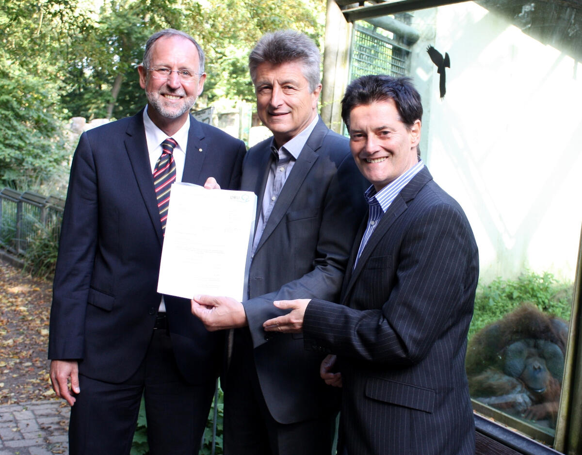 Osnabrück. Die systematische Rodung großer Flächen des tropischen Regenwaldes vernichtet den Lebensraum vieler Tier- und Pflanzenarten – zum Beispiel des Orang-Utans – und wirkt sich negativ auf das globale Klima aus. Besonders betroffen sind die Regenwälder in Indonesien, wo in den letzten 50 Jahren über 74 Millionen Hektar vernichtet wurden, eine Fläche doppelt so groß wie Deutschland. Um Palmöl für Lebensmittel, Kosmetika und Waschmittel sowie „Biosprit“ zu gewinnen, werden jährlich bei der Brandrodung indonesischer Torfmoore rund 1,8 Milliarden Tonnen klimaschädlicher Gase freigesetzt. Um bereits Kindern das weltweite Problem und die Folgen für den Klima- und Artenschutz zu erklären, will der Zoo Osnabrück ein multimediales Umweltbildungsprojekt für Schüler umsetzen. Dr.-Ing. E. h. Fritz Brickwedde, Generalsekretär der Deutschen Bundesstiftung Umwelt (DBU), übergab heute ein Bewilligungsschreiben über rund 124.000 Euro für dieses Projekt an Zoo-Geschäftsführer Andreas Busemann.