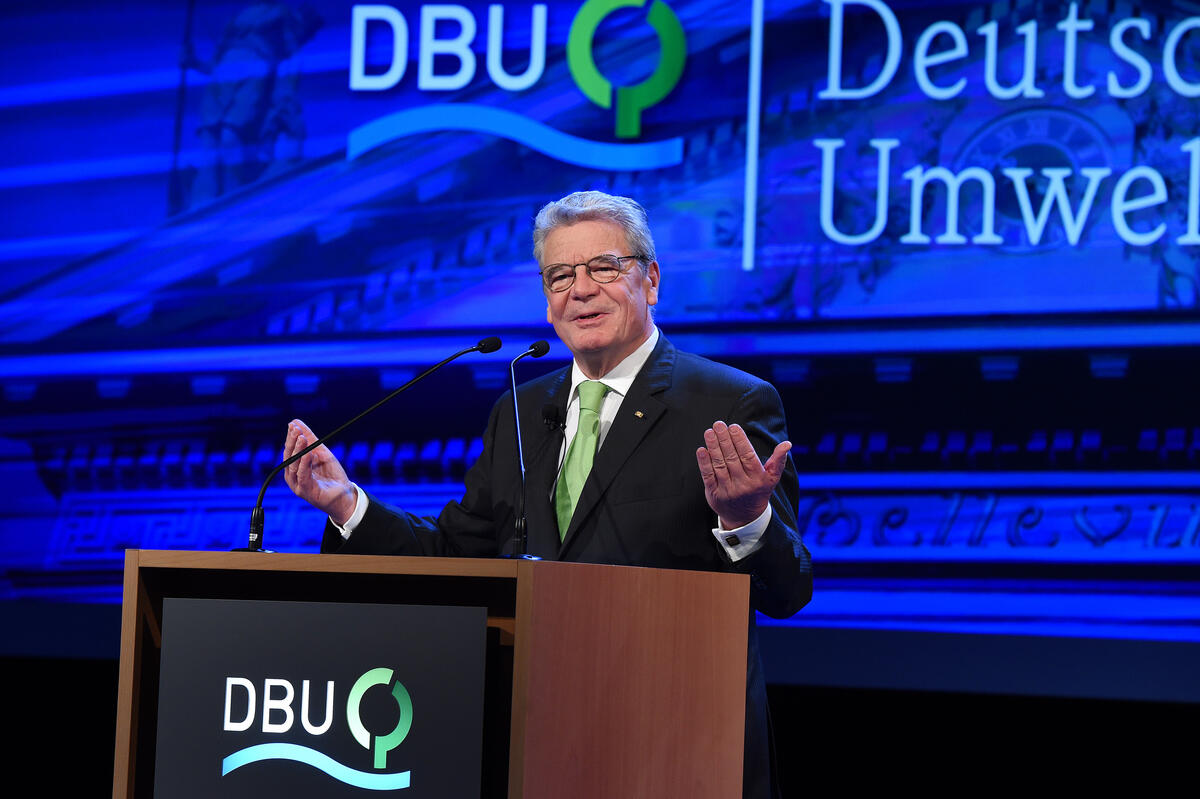Es sei und bleibe auch Aufgabe der Politik, betonte Gauck, ökologische Leitplanken zu setzen und Märkte so zu gestalten, dass Verursacher für Schäden aufkämen und Preise die tatsächlichen Kosten spiegelten. Dann könne sich die Innovationskraft von Forschern, Unternehmen und Bürgern auf das Ziel der Nachhaltigkeit ausrichten. Am Anfang stünden wir damit ja nicht, denn schon heute wüssten viele Unternehmer, dass langfristig ökonomisch nur machbar sei, was auch ökologisch vertretbar sei. Eine entscheidende Frage werde dabei sein, ob klimaschädliche Emissionen endlich überall einen Preis bekämen, damit sich umweltschonende Produktionsweisen, innovative Technologien und sparsame Produkte auch lohnten. Weltweit werde an solchen Preissystemen für Kohlendioxid gearbeitet, und einige Länder hätten sie schon. Aber auch Europa müsse weiter daran arbeiten, einen funktionierenden Emissionshandel aufzubauen.