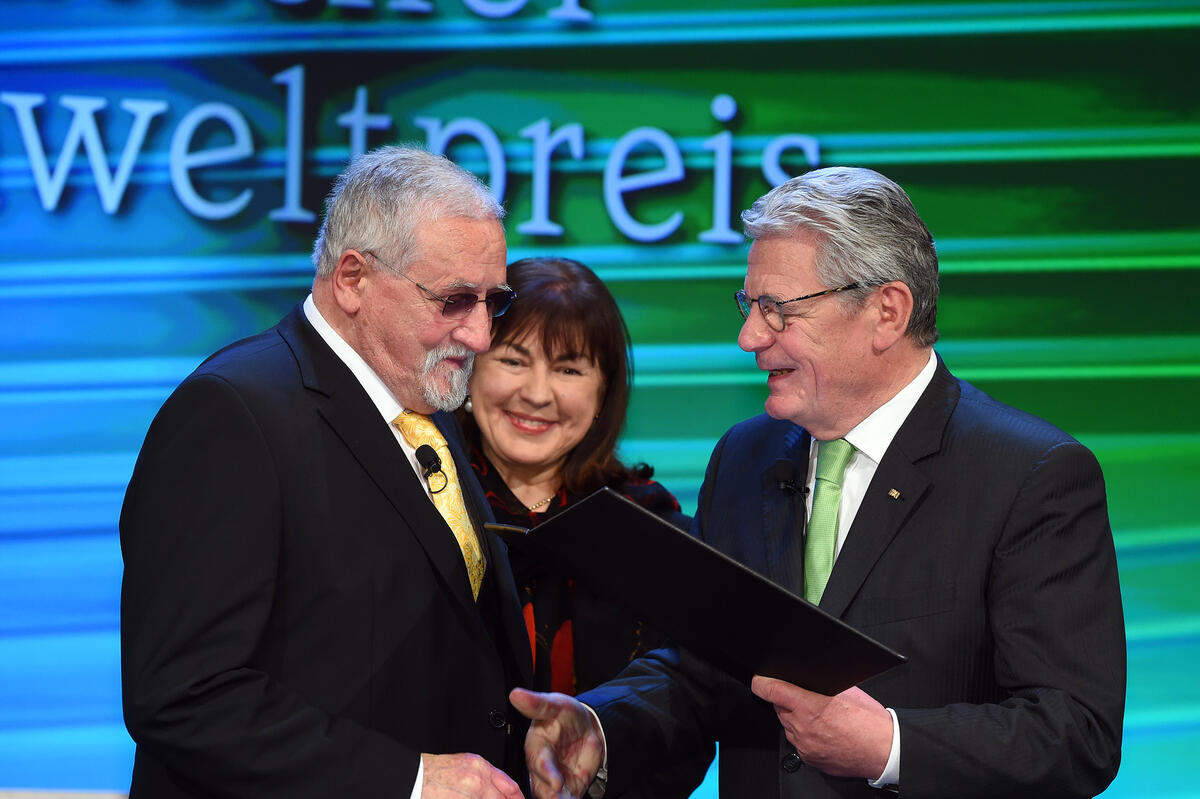 Vor rund 1.200 Festgästen – darunter Bundesumweltministerin Dr. Barbara Hendricks und Hessens Umweltministerin Priska Hinz – betonte Gauck mit Blick auf die Preisträger, Hennicke habe mit seinen Konzepten für eine ressourcen- und energiesparende Art des Wirtschaftens gezeigt, dass man aus viel weniger viel mehr machen könne. Kriegs Sensoren machten Schadstoffe sichtbar und gäben das nötige Wissen, um Umweltschäden zu vermeiden und wertvolle Ressourcen wiederzuverwenden. Und Weinzierl habe mit seinem jahrzehntelangen Kampf gegen die Naturzerstörung und für das Bewahren von Natur, Artenvielfalt und menschlichen Lebensgrundlagen großen Anteil daran, dass Umweltschutz in Deutschland eine politische Kraft geworden sei. Weinzierl habe die Menschen zum Nachdenken gebracht und sich damit großen Respekt erworben. Gauck: „Und eben diesen Respekt möchte ich Ihnen heute ganz persönlich übermitteln und ganz deutlich und im Namen unseres Landes zum Ausdruck bringen.“ Das Staatsoberhaupt an die Adresse des geehrten Trios: „Ich freue mich, unter Menschen zu sein, deren Beharrlichkeit, deren Ideenreichtum und deren Weitblick andere Menschen ermutigt.“