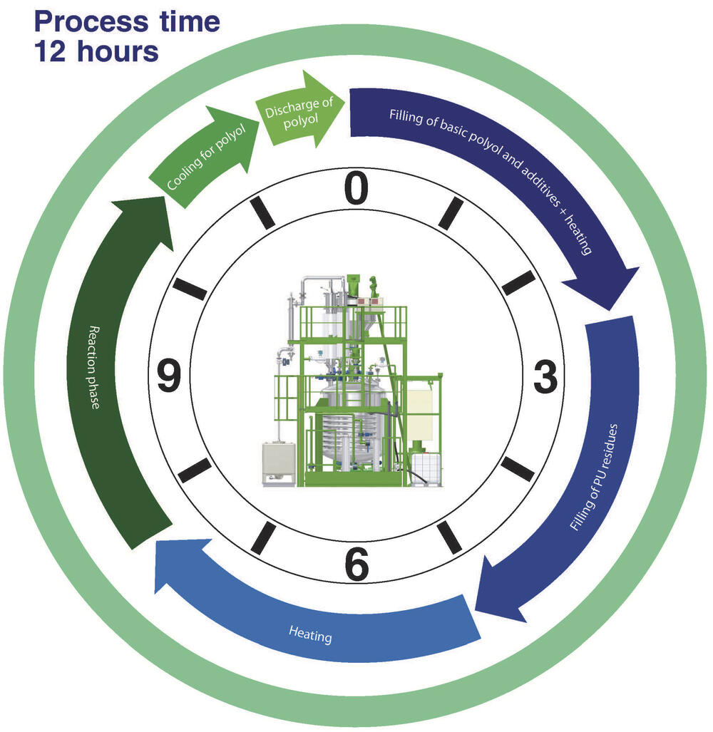 Nach Angaben von Rohstoffherstellern werden allein in Deutschland pro Jahr etwa 200 000 t Polyurethan- Blockweichschaumstoffe (PUR-BWS) produziert. Daraus entstehen beispielsweise Matratzen, Polsterungen oder technische Schäume. Durch Verschnitt bei der Produktion fallen aber auch bis zu 30 000 t Produktionsabfälle jährlich an, für die bisher kein erfolgreicher direkter Recyclingprozess existierte: Nahezu alle chemischen Recyclingverfahren beruhen auf Reaktionen zur Spaltung der Polyurethane, bei denen durchweg gesundheitsgefährdende aromatische Amine entstehen. Diese müssen aufwendig abgetrennt werden, bevor der Polyolanteil des PUR für ein Recycling genutzt werden kann.