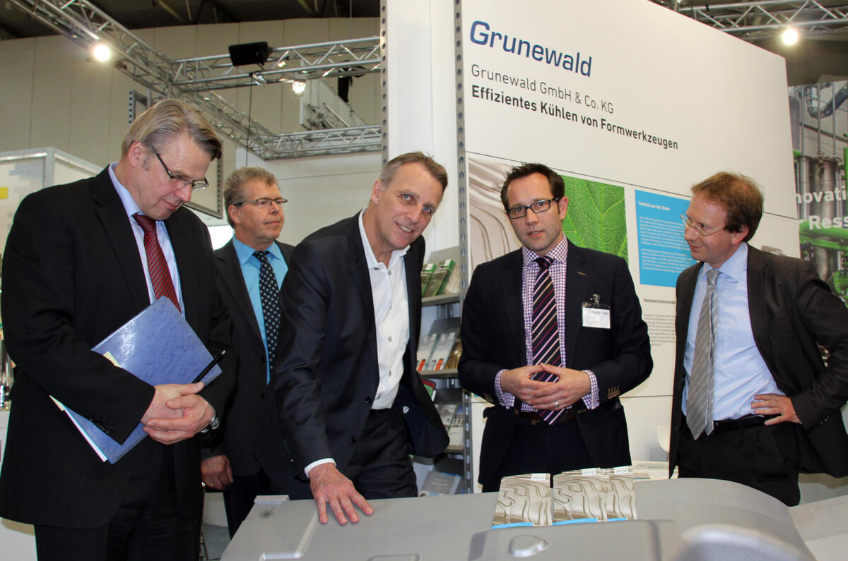 Hannover. Interessiert an wegweisenden, umweltentlastenden Lösungen für einen effizienten Energie- und Ressourceneinsatz mittelständischer Unternehmen zeigte sich heute bei der Hannover Messe Stefan Wenzel, Niedersachsens Umweltminister und Mitglied des Kuratoriums der Deutschen Bundesstiftung Umwelt (DBU), am DBU-Gemeinschaftsstand. „Ein schonender und effizienter Umgang mit Rohstoffen und Energie ist eine Schlüsselkompetenz für die Zukunft. Ressourceneffizienz verringert Umweltbelastungen, stärkt die globale Wettbewerbsfähigkeit und schafft qualifizierte neue Arbeitsplätze“, betonte Wenzel, der gemeinsam mit DBU-Generalsekretär Dr. Heinrich Bottermann den DBU-Stand besuchte. Noch bis zum 17. April präsentieren dort sechs DBU-Projektpartner ihre Arbeit – von der innovativen Rückgewinnung von PUR-Weichschaumstoff über die effiziente Kühlung von Formwerkzeugen nach dem Vorbild der Natur bis hin zu einem ressourceneffizienten Verfahren zur Herstellung von Lithium für Akkumulatoren.