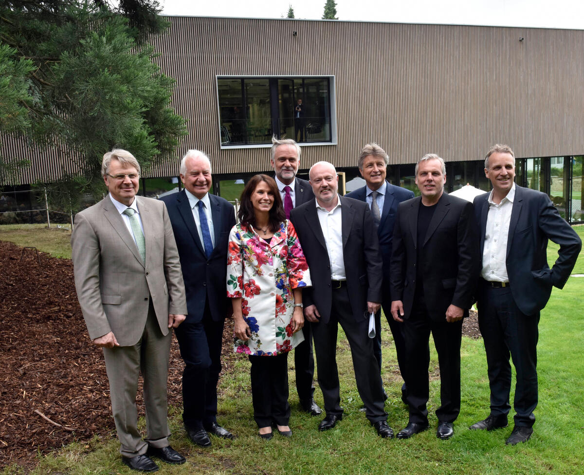 Rund 180 Gäste und Mitarbeiter feierten heute die Einweihung, bei der Architekt Marcus Lembach vom Büro Metaraum aus Stuttgart die Besonderheiten des Hauses erläuterte. „In einer zeitgemäßen Weiterentwicklung der klassischen Holzbauweise kommt die ‚ökorationale‘ Anwendung des Rohstoffs zum Tragen: Als Basis für die Produktion hochleistungsfähiger Bauteile wird Schnittholz dabei technisch zu Holzwerkstoffen ‚veredelt‘“, betonte Lembach. So dienen zertifizierte Weißtannenlamellen aus dem Schwarzwald dem Gebäude als Außenhülle. Der architektonische Ausdruck des Hauses sei – über die Darstellung des ökologischen Aspekts - eine Reverenz an das Parkgelände, ein „dienendes“ Haus, ein Zweckbau im besten Sinne, sozusagen ein „Passepartout“ für die wechselnden Inhalte der Ausstellungen der DBU.