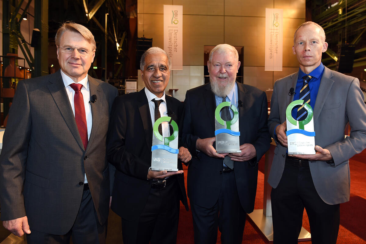 Essen. Der Deutsche Umweltpreis der Deutschen Bundesstiftung Umwelt (DBU) ist zum 23. Mal vergeben. Aus den Händen von Bundespräsident Joachim Gauck und der DBU-Kuratoriumsvorsitzenden und Parlamentarischen Staatssekretärin im Bundesumweltministerium, Rita Schwarzelühr-Sutter, nahmen heute in Essen der Klima- und Meeresforscher Prof. Dr. Mojib Latif (61, Kiel) und der global agierende Nachhaltigkeitswissenschaftler Prof. Dr. Johan Rockström (49, Stockholm) den höchstdotierten, unabhängigen Umweltpreis Europas in Empfang. Die DBU will mit der Auszeichnung der Klimaexperten im Vorfeld der Ende November in Paris stattfindenden Klimakonferenz der Vereinten Nationen einen Appell an die internationale Staatengemeinschaft richten, entschlossen zu handeln und so die Zukunft des Planeten Erde zu sichern. Latif und Rockström erhalten je 245.000 Euro. Mit dem bisher viermal von der DBU zusätzlich vergebenen, mit 10.000 Euro dotierten Ehrenpreis wurde Prof. em. Dr. Michael Succow (74, Greifswald) für sein lebenslanges Naturschutz-Engagement geehrt.