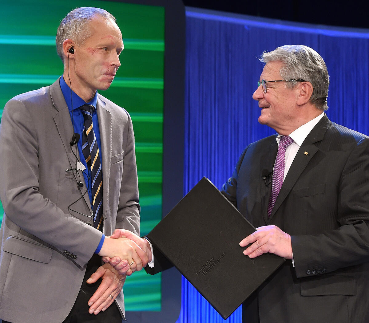 Vor rund 1.200 Festgästen – darunter Nordrhein-Westfalens Ministerpräsidentin Hannelore Kraft und Landesumweltminister Johannes Remmel – betonte Gauck, die drei Preisträger arbeiteten daran, „dass wir unseren Kindern eine Welt hinterlassen, in der man frische Luft atmen, klares Wasser trinken und von gesunden Böden ernten kann – in der also das Selbstverständliche selbstverständlich ist“. Rockström habe mit seinem Konzept der planetaren Grenzen objektive Belastungsgrenzen der Erde ausgerechnet und so politischen Entscheidungsträgern eine Prioritätensetzung im Umwelt- und Naturschutz ermöglicht. Latif mache seit Jahren darauf aufmerksam, dass unser Planet ohne intakte Ozeane unbewohnbar werde und habe die Gabe, komplizierte Sachverhalte einfach und nachvollziehbar darzustellen. Und Succow habe als genialer Netzwerker des deutschen Naturschutzes im deutschen Wiedervereinigungsjahr 1990 als stellvertretender DDR-Umweltminister rund 4,5 Prozent der DDR-Fläche dauerhaft für den Naturschutz gesichert und so die Grundlage für das gesamtdeutsche Nationalparkprogramm gelegt.