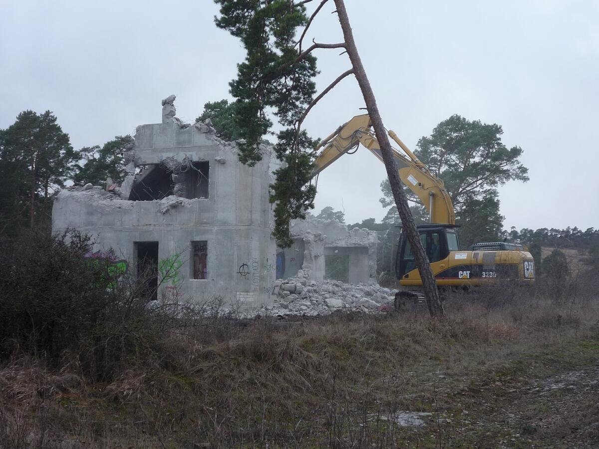 Auch sechs versiegelte Gebäudeflächen aus dem militärischen Übungsbetrieb haben Abrissunternehmer im Auftrag der DBU-Tochter in diesem Jahr der Natur zurückgegeben: Drei Übungshäuser, eine stillgelegte Panzerwaschanlage, das dazugehörige Pumpenhaus sowie ein unterirdischer Tank mussten den Baggern weichen – nicht zuletzt, um das Gefahrenpotenzial der alten Gebäude zu entschärfen und der Verkehrssicherungspflicht genüge zutun. Bei dem 120.000 Euro teuren Abriss hatte die DBU-Tochter den Artenschutz im Blick: So profitieren zukünftig Fledermäuse von dem umgebauten Keller der ehemaligen Manöver-Kulisse. „Wir haben ihn zu einem Fledermaushotel umgestaltet“, betont Haßlinger.