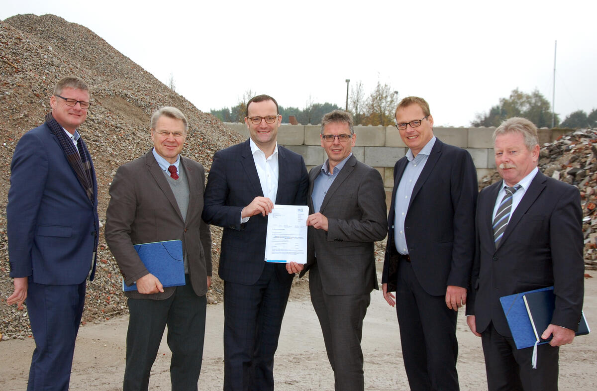 Heek. „Werden Wohn- und Geschäftshäuser abgerissen, fallen in Deutschland jährlich bis zu 58 Millionen Tonnen Bauschutt an. Damit ist dies die Hauptquelle für Abfälle aus Bau- und Abbrucharbeiten. Nur knapp Dreiviertel hiervon werden etwa für Recycling-Beton wiederverwertet. Doch wie kann die Recyclingrate erhöht werden?“ fragte Jens Spahn MdB, Kuratoriumsmitglied der Deutschen Bundesstiftung Umwelt (DBU) und Parlamentarischer Staatssekretär beim Bundesminister der Finanzen, anlässlich der Übergabe des DBU-Bewilligungsschreibens zur Förderung eines Projekts in Heek. Spahn weiter: „Um die natürliche Lebensgrundlage zu schonen und nicht nur Boden, sondern auch die Gewässer, zu schützen, sind innovative Problemlöser gefragt.“ Das Betonwerk Büscher habe sich mit der jetzt bewilligten Projektförderung der DBU zum Ziel gesetzt, die Einsatzmöglichkeiten für Recycling-Beton zu erhöhen, indem erstmalig auch sehr kleinteilige gemischte Bauabfälle als Gesteinszusatz erprobt werden um Fertigbauelemente zu entwickeln.