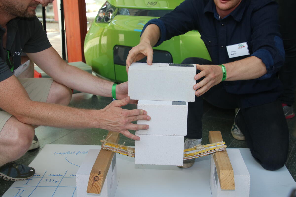 Anschließend ging es an die Konstruktion: Für den Wettbewerb entwarfen und konstruierten vier Teams möglichst stabile Brücken. Nach 50 Minuten Bauzeit stellten sich die Brücken dem Belastungstest. Dafür wurden sie über einen 40 Zentimeter breiten Abgrund gelegt werden und mit immer schwereren Steinen belastet. Brach die Brücke zusammen, wurde das Gewicht abgelesen und die Nutzlast errechnet. Alle Brücken hielten mindestens einer 14 Kilogramm schweren Belastung stand und die Siegerbrücke sogar unglaublichen 32 Kilogramm, bei einem Eigengewicht von 258 Gramm. Die Siegerbrücke bestand aus drei Papierrollen, die durch eine geschickte Wickeltechnik mit Hanfseil und Bambus verstärkt wurde.