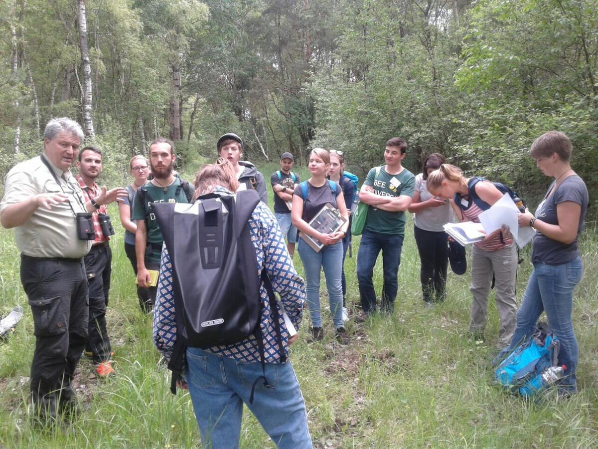 Herr Schmidt machte uns während der Wanderung auf die zahlreichen Besonderheiten der Wersener Heide aufmerksam wie der speziellen Vegetation in der Digging Area, den Habitaten wie Trockenrasen oder Borstengrasrasen oder seltenen Arten wie dem Knabenkraut. In mehreren Stationen beschäftigen wir uns mit den Standorten Offenland und Wald, die den Hauptanteil der Fläche ausmachen (neben einigen Gewässern und landwirtschaftlich genutzten Flächen). Dabei wurden auch die Grundlagen der Pflege dieser für die Artenvielfalt wichtigen Landschaft erläutert. Zur Erhaltung der Offenlandlebensräume werden in der Wersener Heide unter anderem Beweidung, Mahd und andere Maßnahmen genutzt.