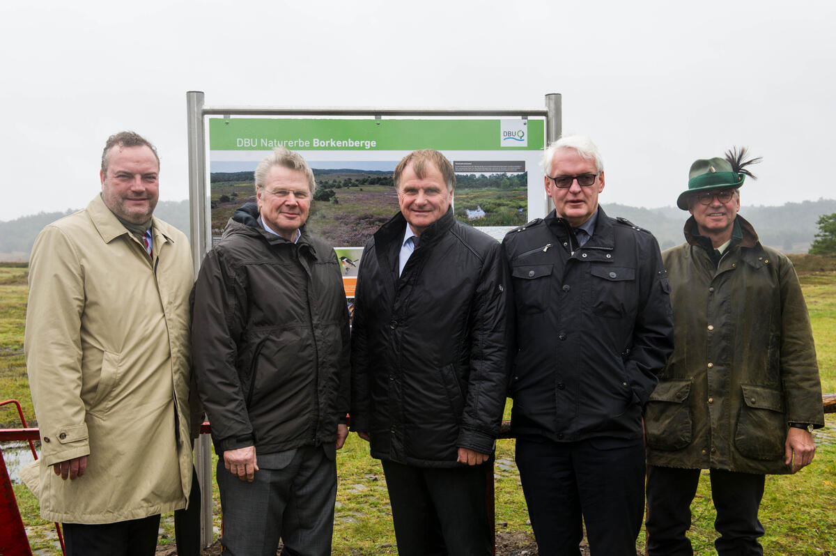 Die DBU-Naturerbefläche Borkenberge zum Beispiel, die auf den Gemarkungen der Städte Haltern am See und Lüdinghausen liegt, kann aus Sicherheitsgründen noch nicht zugänglich gemacht werden. „Wir haben die Zusicherung, dass mittelfristig dort, wo es naturschutzfachlich möglich ist und es die militärischen Altlasten sicherheitstechnisch zulassen, Betretungsmöglichkeiten angeboten werden“, so Lüdinghausens Bürgermeister Richard Borgmann. Auch Halterns Repräsentant Bodo Klimpel machte deutlich: „Ich bin mir sicher, dass es uns gemeinsam gelingen wird, die Naturschutzziele der DBU und die regionalen Interessen in vertrauensvoller Zusammenarbeit in Einklang zu bringen.“ Informationstafeln, die maßgeblich in Zusammenarbeit mit dem Naturschutzzentrum Coesfeld sowie den Biologischen Stationen Recklinghausen und Zwillbrock entwickelt wurden und über Historie, landschaftliche Besonderheiten sowie Tier- und Pflanzenwelt Auskunft geben, wurden an begehbaren Wegen der Naturerbefläche Borkenberge bereits aufgestellt.