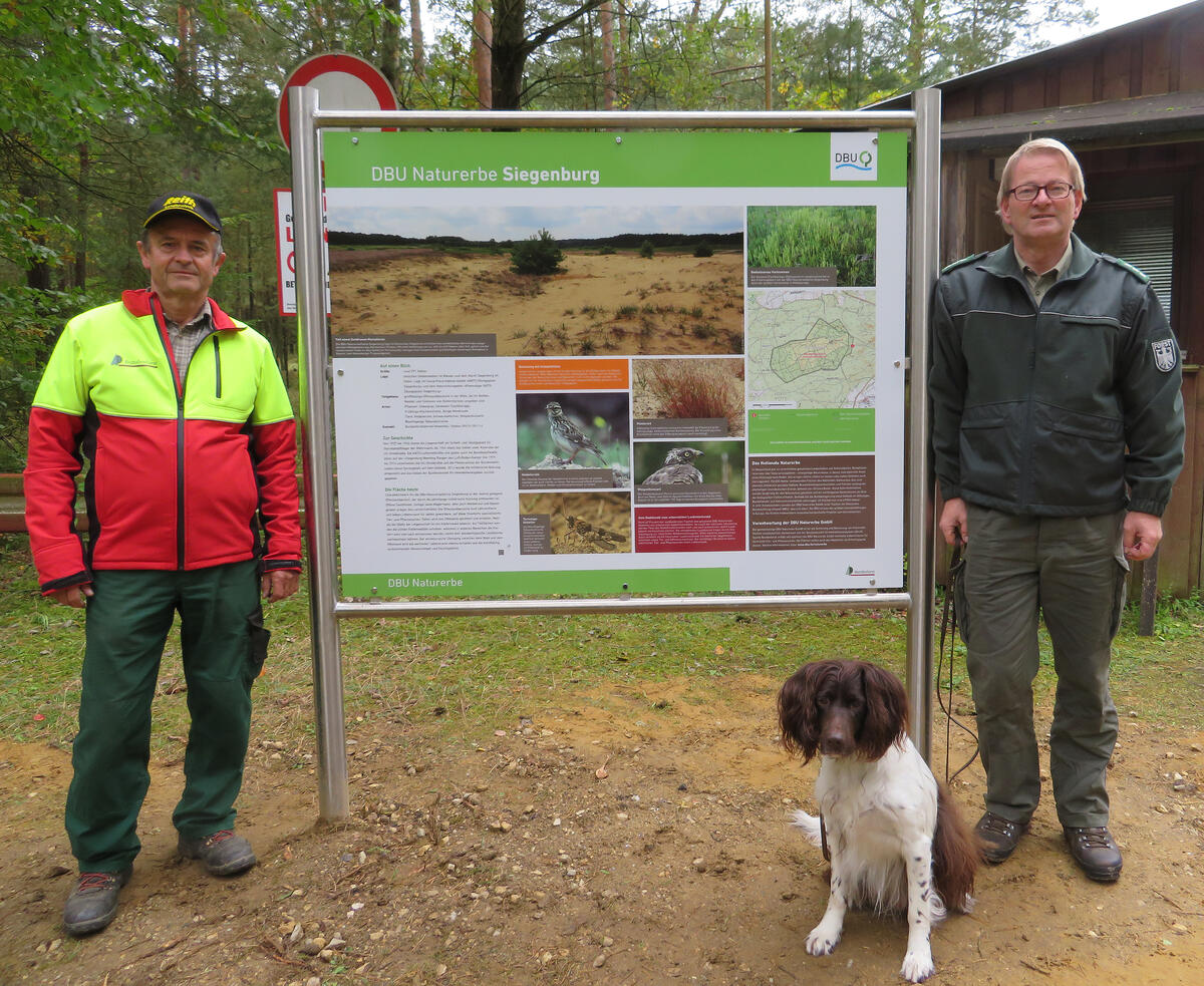 Siegenburg. Militärische Nutzung und Naturschutz haben zunächst wenig gemeinsam. Doch auf ehemaligen Bombenabwurfplätzen haben sich teils wertvolle Landschaften mit einer hohen Artenvielfalt entwickeln können. Auch die Naturerbefläche Siegenburg hat eine militärische Historie, auf die nun durch Informationstafeln aufmerksam gemacht wird, auf denen Besonderheiten der Fläche dargestellt werden. Revierleiter Walter Bollmann vom Bundesforstbetrieb Hohenfels hat nun gemeinsam mit Forstwirt Herbert Brüderle die Tafeln aufgestellt. Seit dem 1. Oktober gehört die Fläche zur Kulisse des DBU Naturerbes, einer gemeinnützigen Tochter der Deutschen Bundesstiftung Umwelt (DBU), die die naturschutzgerechte Betreuung und Verantwortung übernimmt. In Zusammenarbeit mit der Sparte Bundesforst der Bundesanstalt für Immobilienaufgaben werden naturschutzfachliche Maßnahmen umgesetzt. „Wir wollen diese wertvollen Lebensräume schützen und gleichzeitig die Natur erlebbar machen, soweit keine Gefahr für Besucher durch Munitionsbelastung besteht“, betont Prof. Dr. Werner Wahmhoff, stellvertretender Generalsekretär der DBU und fachlicher Leiter des DBU Naturerbes.
