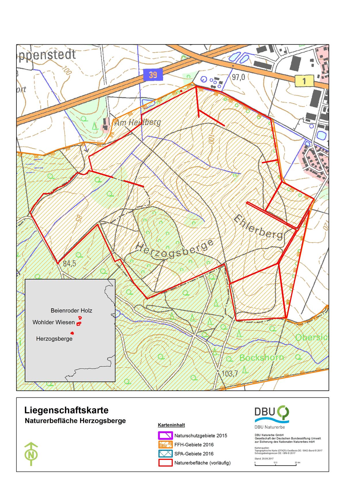 Cremlingen. Herzogsberge gehört jetzt der DBU Naturerbe GmbH: Mit der notariellen Beurkundung des Schenkungsvertrages ist der letzte Schritt getan, um die gemeinnützige Tochter der Deutschen Bundesstiftung Umwelt (DBU) als Eigentümer der ehemals militärisch genutzten Fläche ins Grundbuch einzutragen. Gemeinsam mit den Kooperationspartnern vor Ort kümmert sie sich um den Naturschutz auf dem rund 130 Hektar (ha) großen Areal. Bisherige Eigentümerin war die Bundesanstalt für Immobilienaufgaben (BImA). „Mit der notariellen Unterzeichnung der einzelnen Schenkungsverträge übernehmen wir vollständig die Verantwortung“, betonte Josef Feldmann, Prokurist des DBU-Naturerbes. „Unser Ziel ist, die Fläche möglichst in einem naturschutzfachlich optimierten Zustand für nachfolgende Generationen zu erhalten.“ Für Niedersachsen ist Herzogsberge die erste Fläche des dritten Pakets zum Nationalen Naturerbe, die jetzt juristisch Eigentum der DBU ist. „Dass es gelungen ist, die Herzogsberge noch in diesem Jahr notariell zu übertragen, unterstreicht einmal mehr die hervorragende Zusammenarbeit zwischen DBU und Bundesanstalt“, so Christian Kühl, Mitarbeiter der BImA, Sparte Bundesforst.