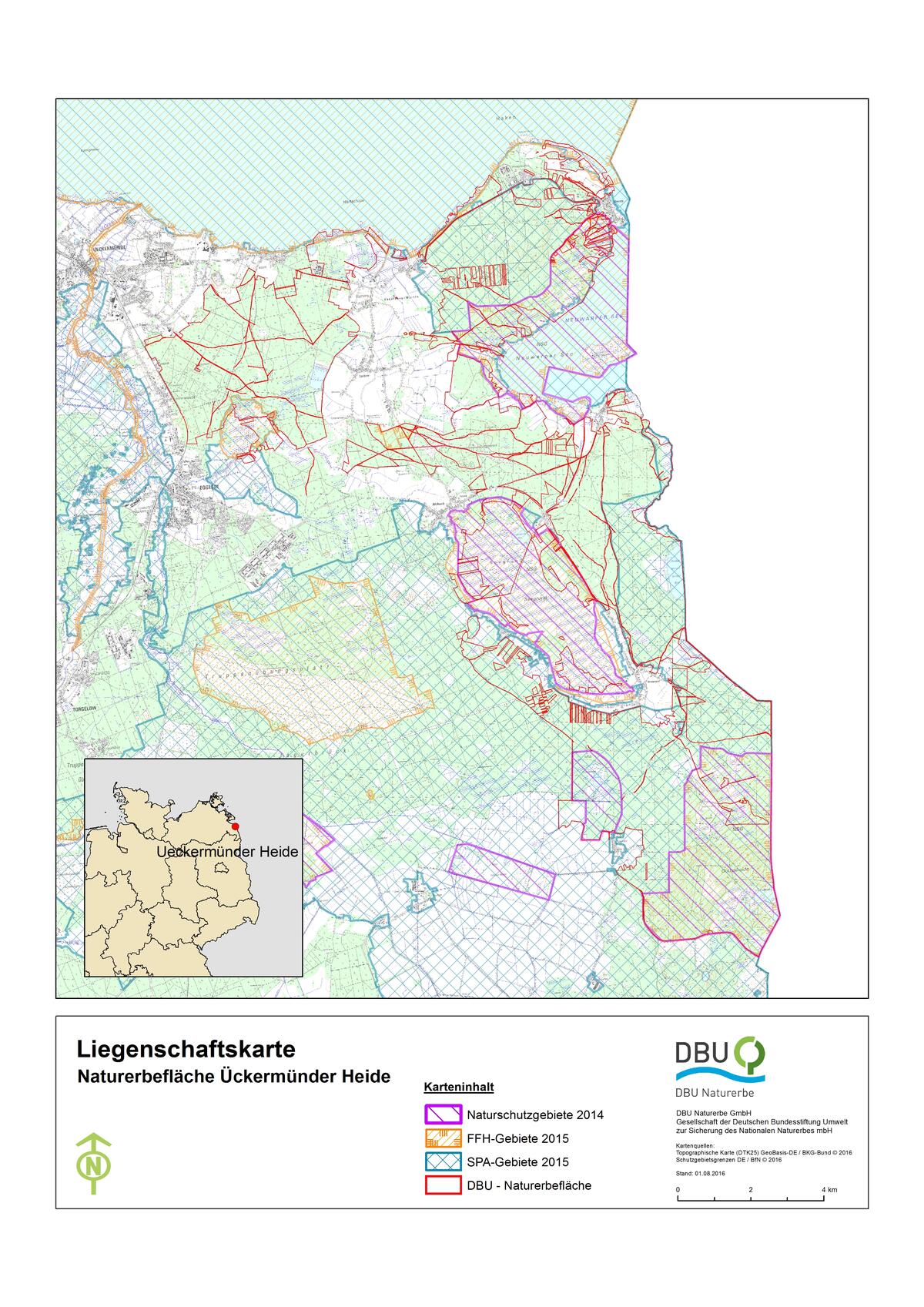 Die DBU-Naturerbefläche Ueckermünder Heide ist eine von 70 Liegenschaften der Stiftungstochter der DBU aus Osnabrück, die die Flächen treuhänderisch für zukünftige Generationen verwaltet und unter naturschutzfachlichen Aspekten sichert. Insgesamt hat sie rund 69.000 Hektar vor allem ehemals militärisch genutzte Flächen vom Bund übernommen. Auf den Flächen sollen offene Lebensräume mit seltenen Arten durch Pflege bewahrt, Wälder möglichst ihrer natürlichen Entwicklung überlassen, artenarme Forste zu naturnahen Wäldern umgewandelt und Feuchtgebiete sowie Gewässer ökologisch aufgewertet oder erhalten bleiben.