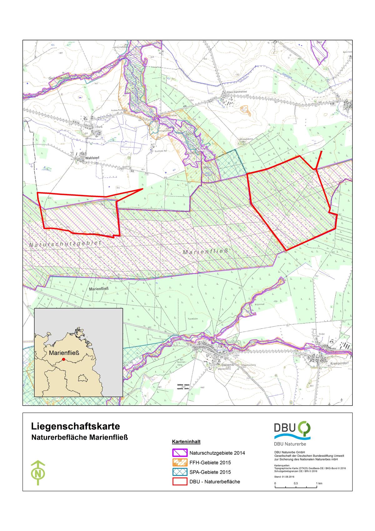 Die gemeinnützige DBU-Tochter versteht sich als Treuhänderin des Nationalen Naturerbes für nachfolgende Generationen. Die DBU-Naturerbefläche Marienfließ ist eine von 70 Flächen der Gesellschaft. Sie hat die rund 474 ha große Liegenschaft 2010 vom Bund als Teil des Nationalen Naturerbes übernommen. Auf bundesweit insgesamt rund 69.000 ha im Eigentum der Stiftungstochter – größtenteils ehemalige Militärflächen – sollen offene Lebensräume mit seltenen Arten durch Pflege bewahrt, Wälder möglichst ohne menschlichen Eingriff ihrer natürlichen Entwicklung überlassen, artenarme Forste zu naturnahen Wäldern umgewandelt und Feuchtgebiete sowie Gewässer ökologisch aufgewertet oder erhalten werden.